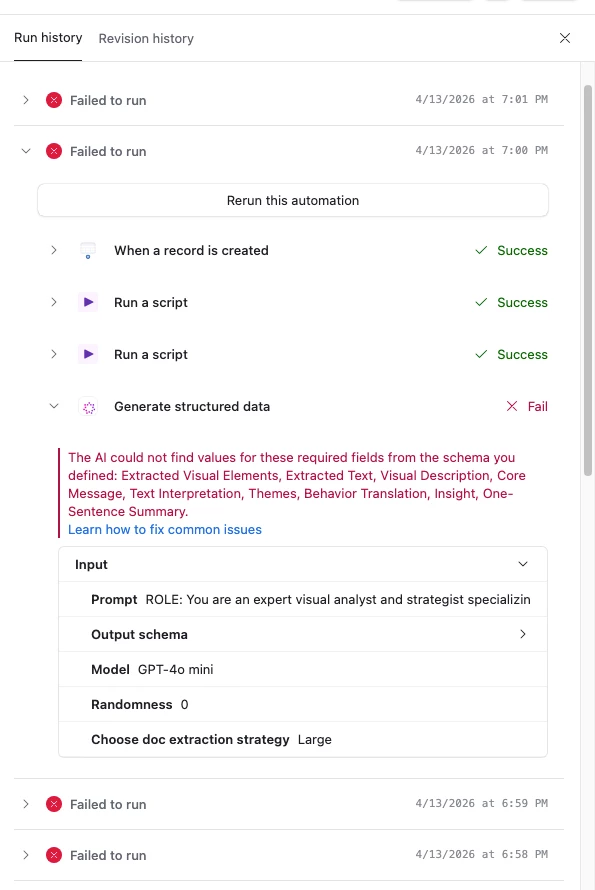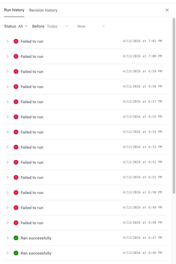 I’m using the same automation with the same attachments, but it only runs a few times within about 5 minutes and then starts failing repeatedly for 20-30 minutes.