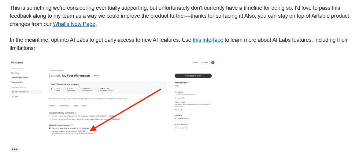 “ I’m sorry for the trouble you’ve been having while trying to use the image generation or image analysis features. These features you may have seen in our marketing materials are not yet live, but they are part of a powerful set of upcoming capabilities we’re actively developing within our new Omni interface. These features will enable users to generate visual content and extract insights from images directly within Airtable, greatly expanding what’s possible with AI-powered workflows.