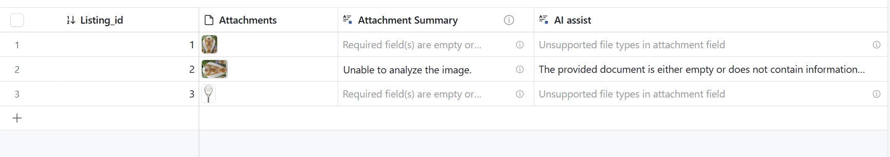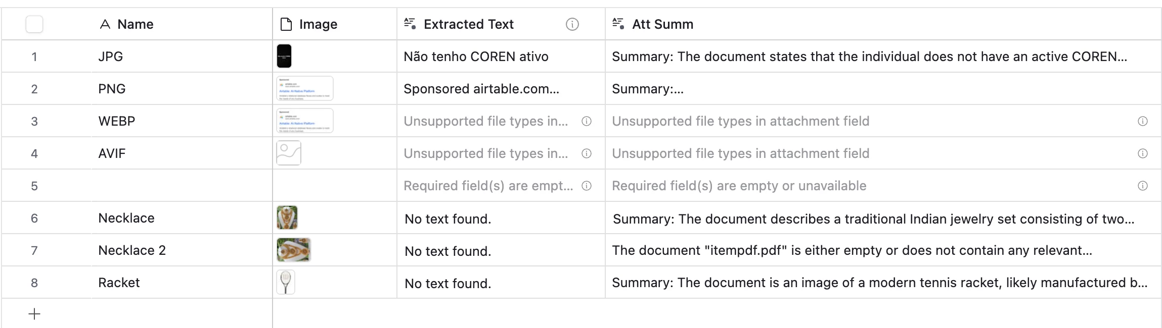 Hi @Stephen_Juth , I am unable to resolve it with using field agents in airtable. I have a simple table with two fields with field agents - Analyze Attachment and Attachment summary, but both do not work. The Three attachments are .png, .pdf and .jpg. https://airtable.com/appMnHbLFegjHAspl/shrZ36Ld43Tisnnsj