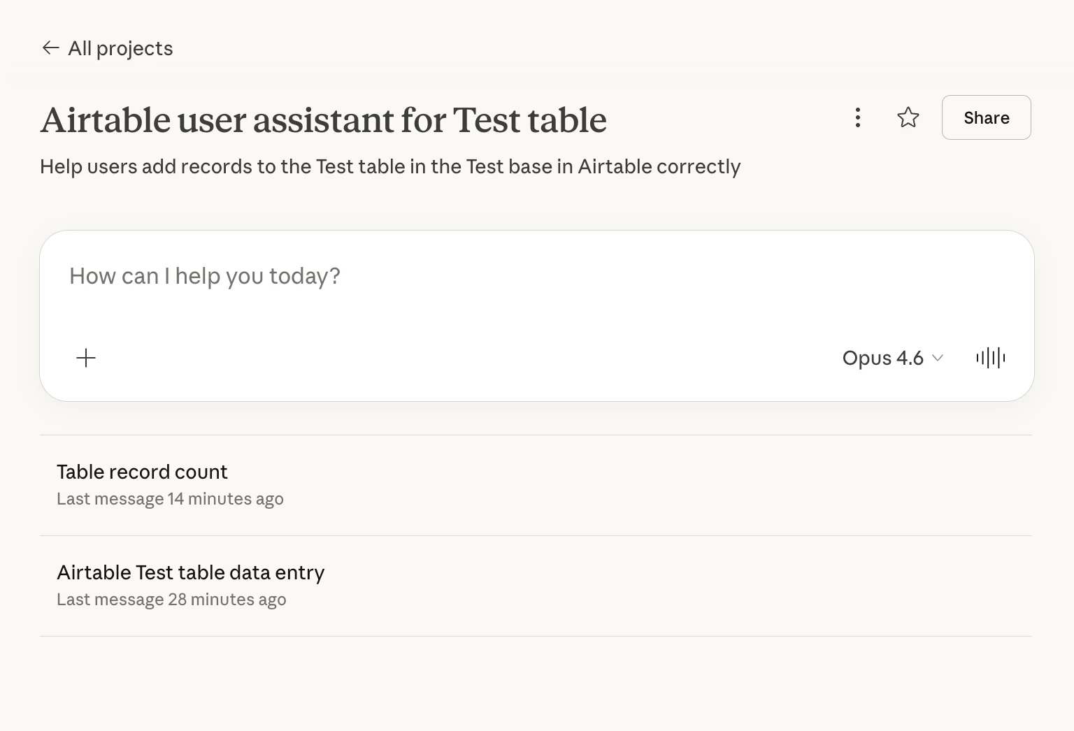 First I created a new project. I called it “Airtable user assistant for Test table”.