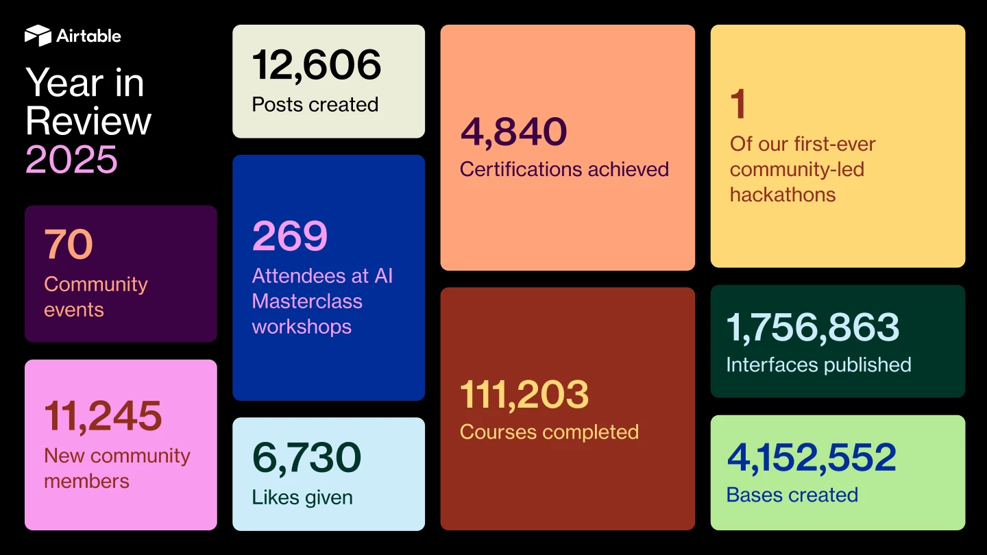 Whether you were answering questions at 2am, sharing your latest base creation, or cheering on someone's first automation success, every member of this community has helped make it the vibrant, supportive space it is. Thank you for showing up, sharing your expertise, and continuing to push the boundaries of what's possible with Airtable.
