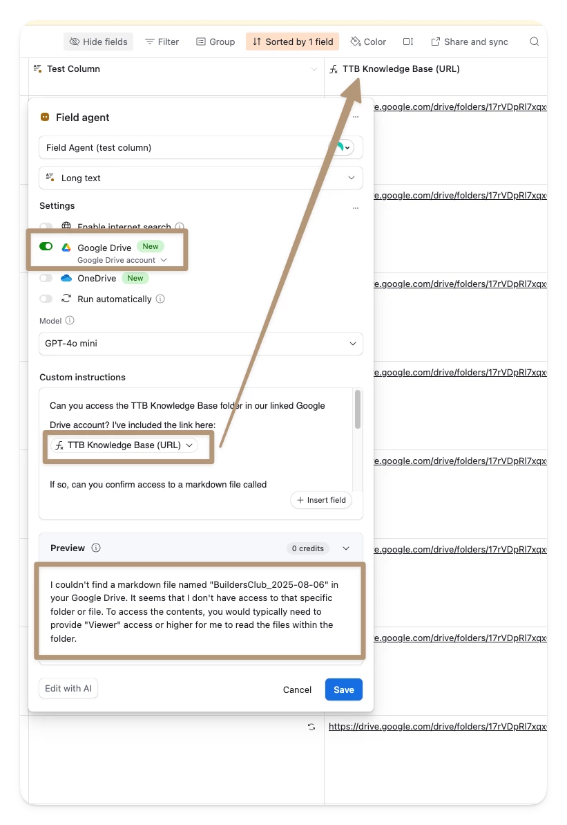 I then set-up a test column and prompt designed to confirm if the Field Agent can access the folder and reference a specific file.