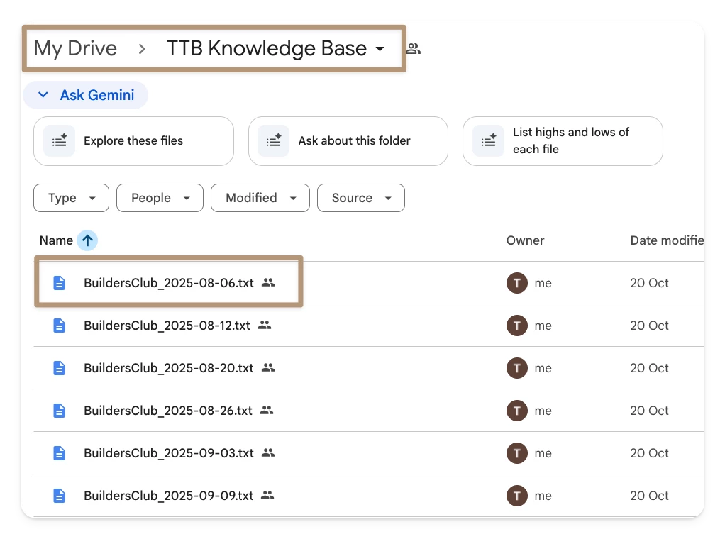“I couldn’t find a markdown file named ‘BuildersClub_2025-08-06’ in your Google Drive. It appears that I do not have access to the contents of the folder you provided, even with ‘Viewer’ access set for anyone with the link.”
