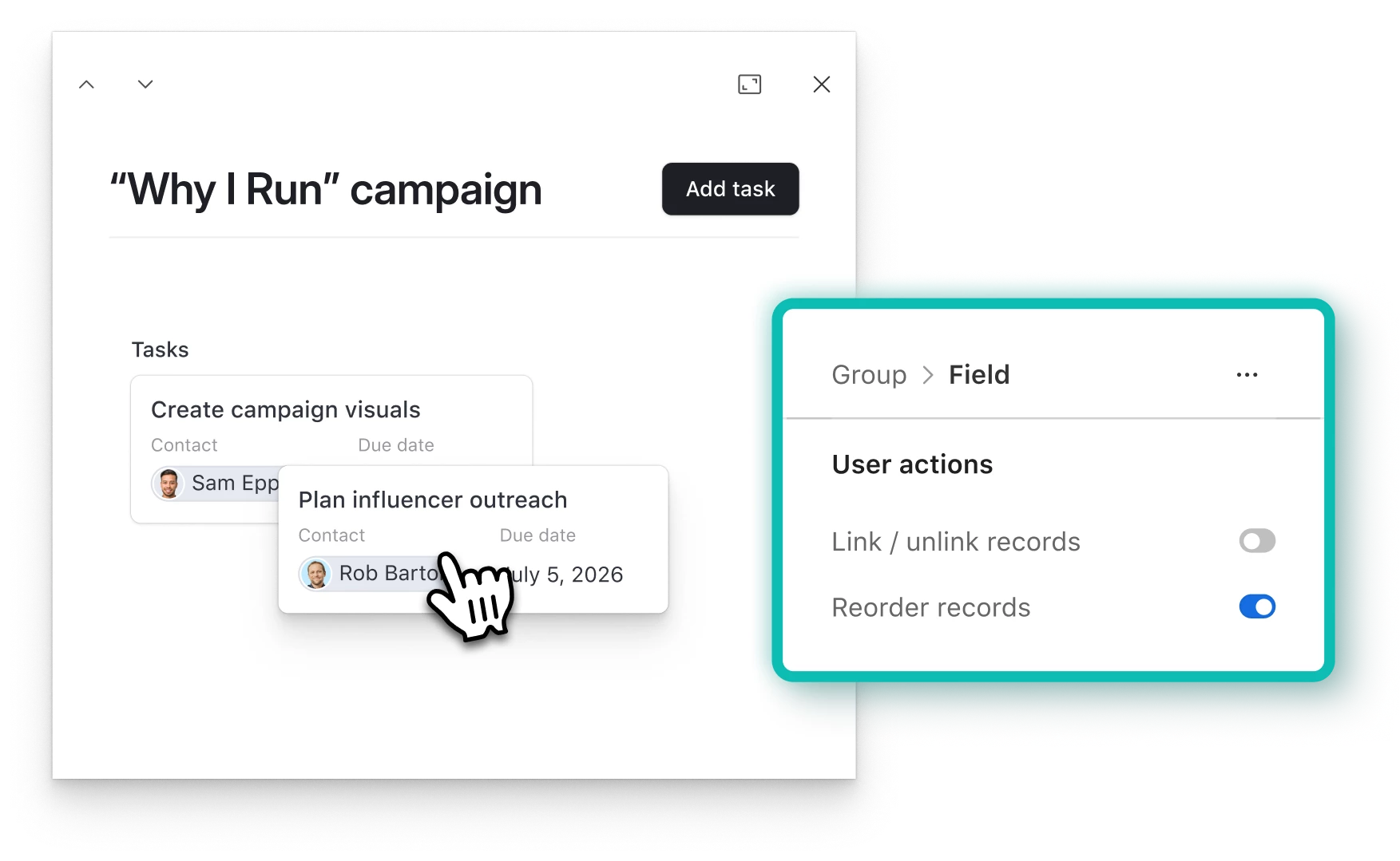 We've added a new setting to Linked Records (in Card style) that lets end users reorder records without needing link/unlink to be turned on. Previously, the only way to allow users to reorder Linked Records was to also enable link/unlink. Now builders can separate those permissions and give users the flexibility to rearrange without the risk of accidentally unlinking records.