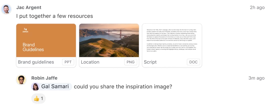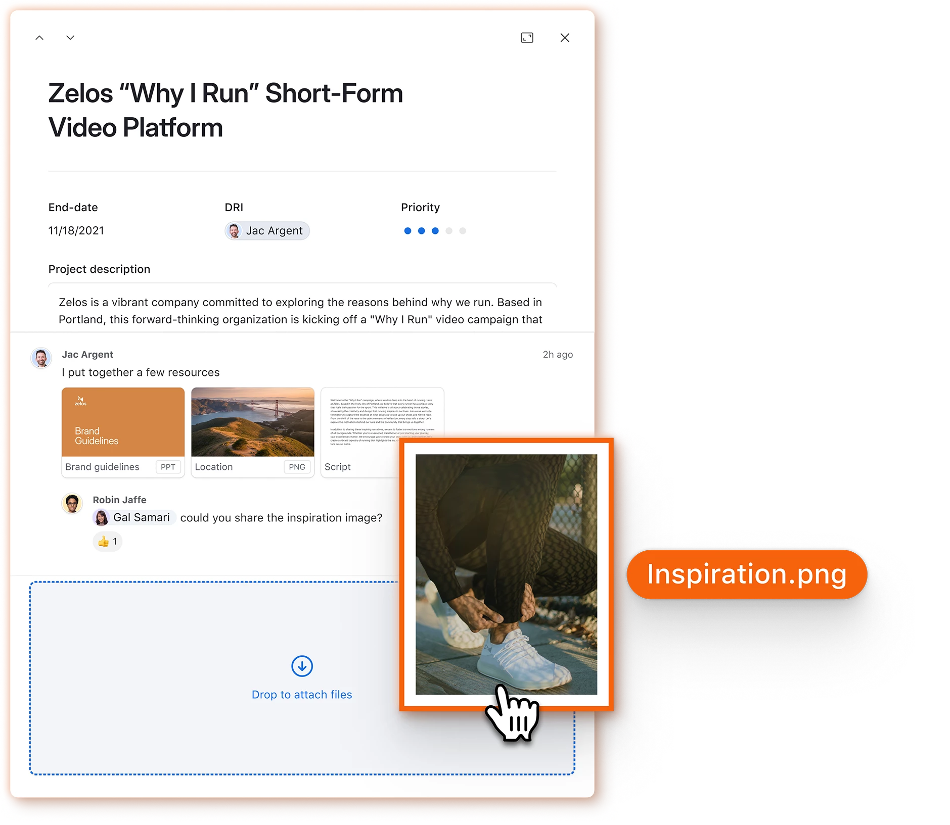 Instead of describing what you're referring to or linking out to another tool, drop the file directly into the conversation. Think design mockups, screenshots of bugs, signed contracts, or reference docs.