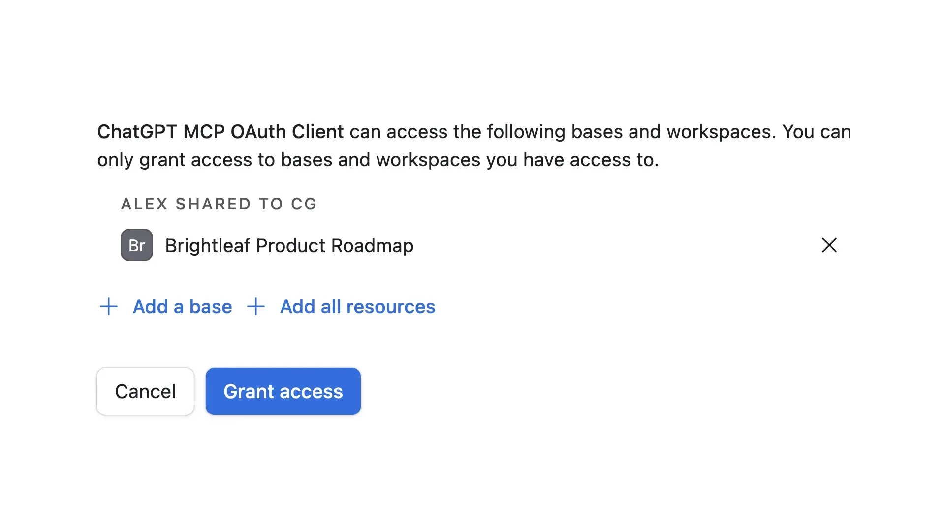 - Select bases: Choose which Airtable bases or workspaces you want ChatGPT to access