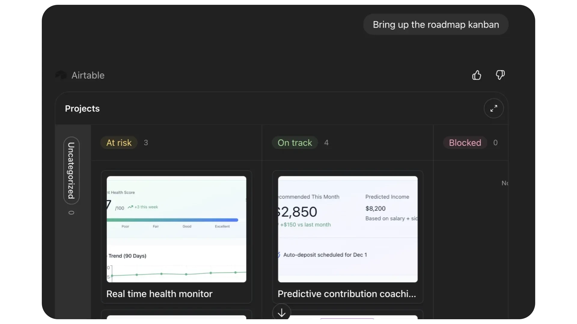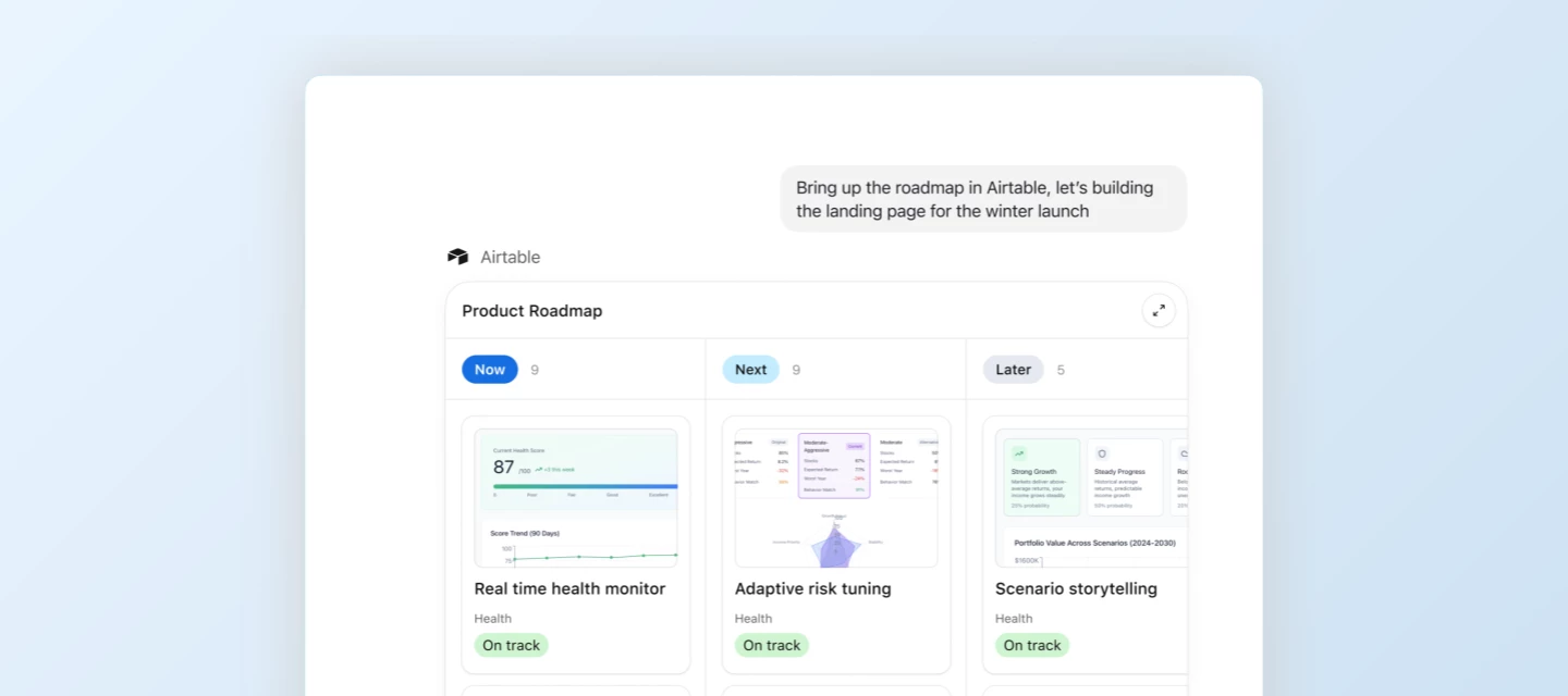 - Reference Airtable data while generating content in ChatGPT: Pull the latest product roadmap updates as you prepare for a meeting, analyze patterns in customer feedback, or understand why your best marketing campaigns are overperforming.