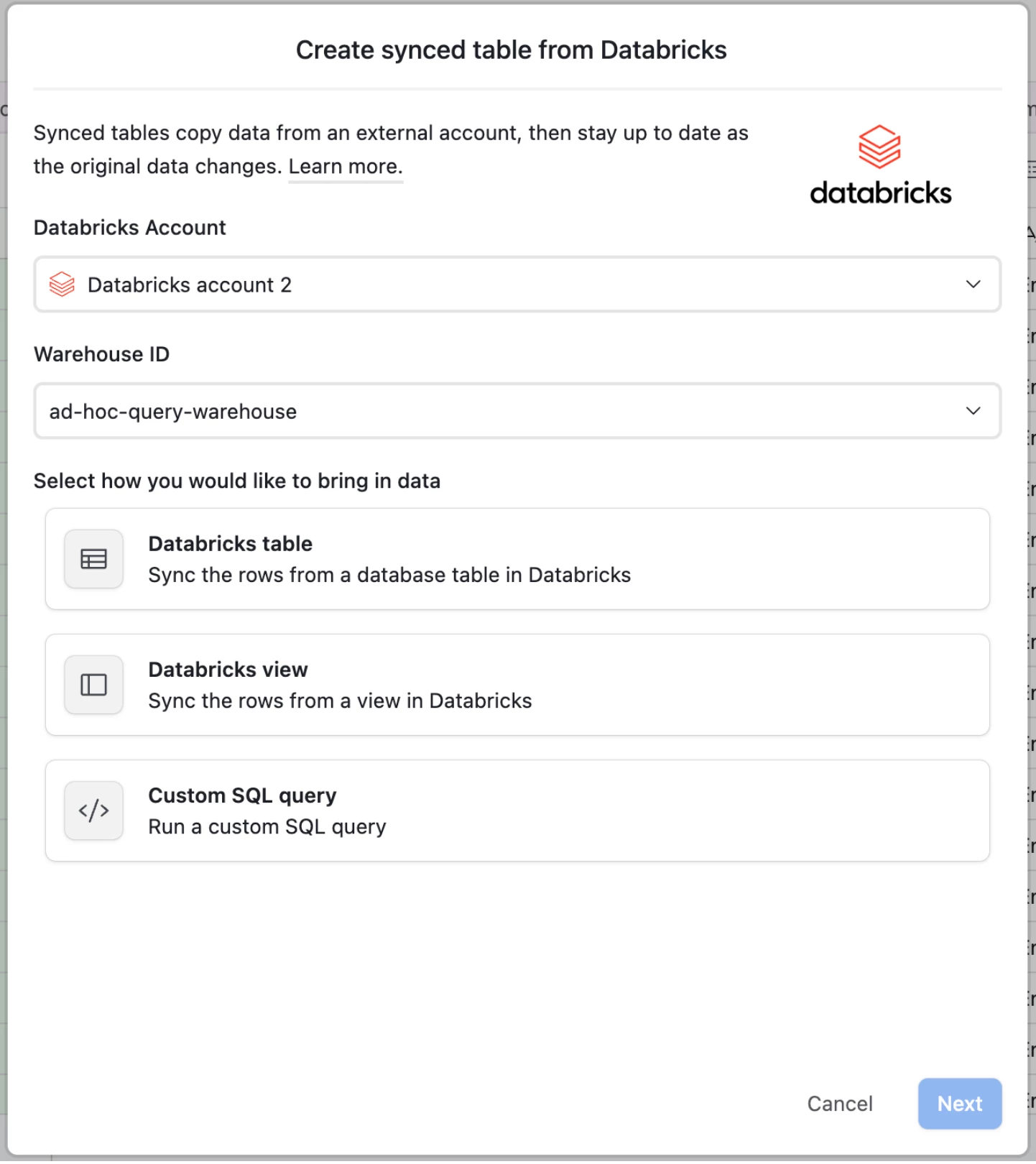 Databricks is now available as a native sync source. And for both Databricks and Snowflake, you can now sync the result of any custom SQL query, not just predefined views or tables, directly into Airtable.