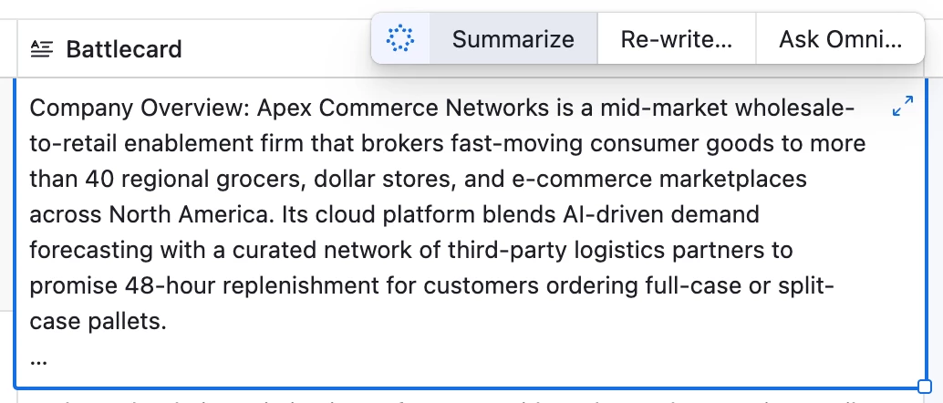 For example, when you’re working in a long text field, Omni can help you draft, rewrite, or answer questions about the content as you type.