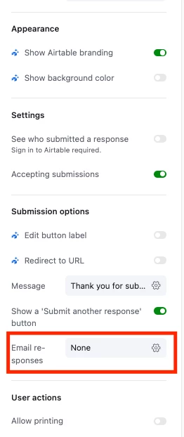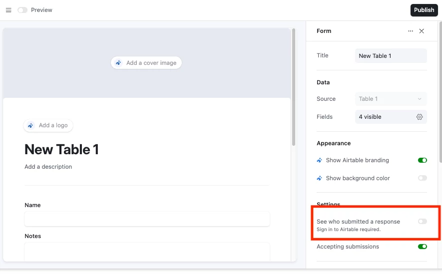 When toggled on, form submitters will be asked to sign into Airtable or make an account so their name and email address can be collected with their form submission.