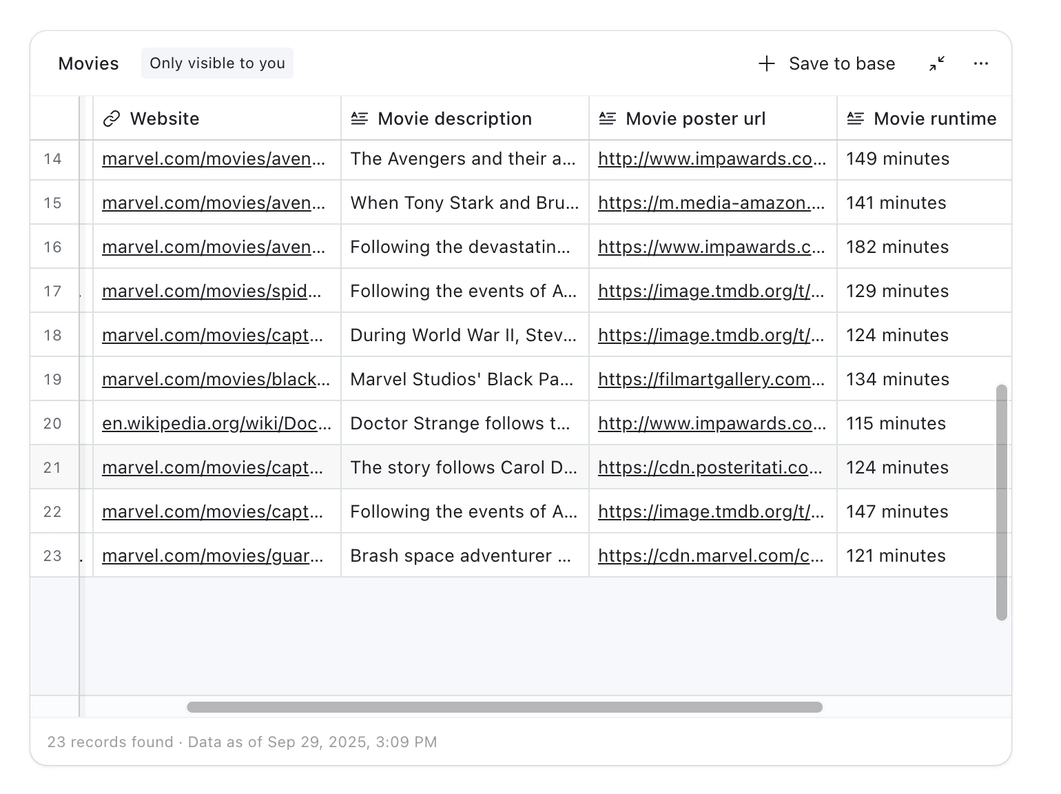 Yes, that’s a lot of records that would overload the prompt input. Makes sense as a use case and we’ll look into this. In the meantime, you should be able to at least find poster URLs with the new web image search in Field Agents.
