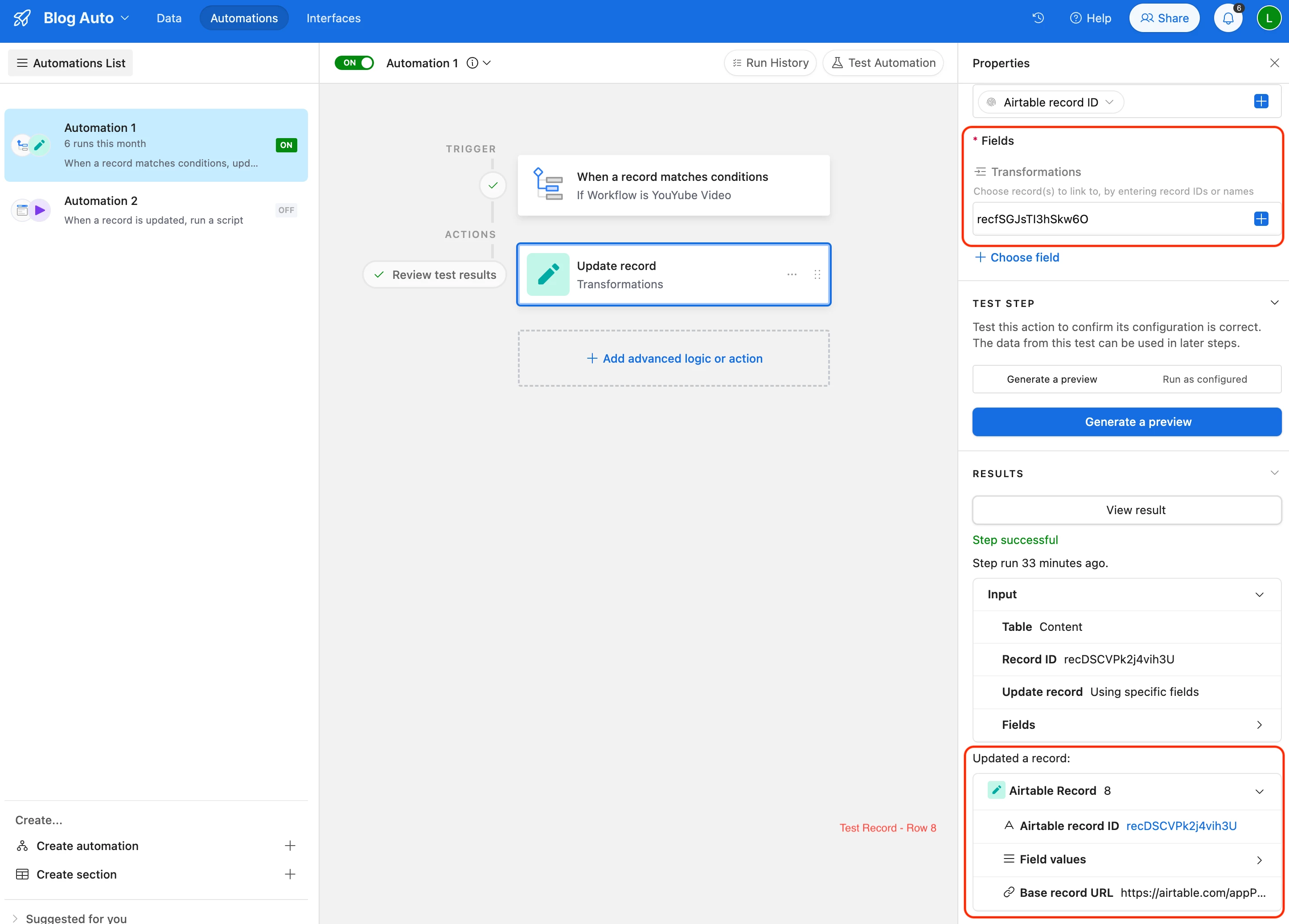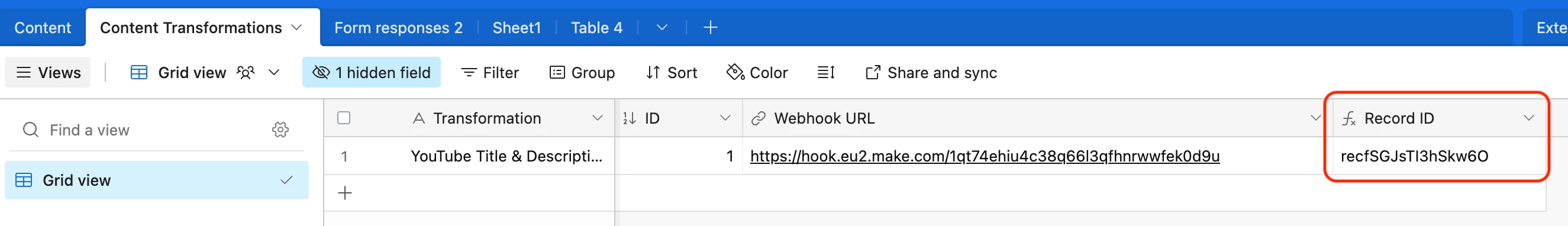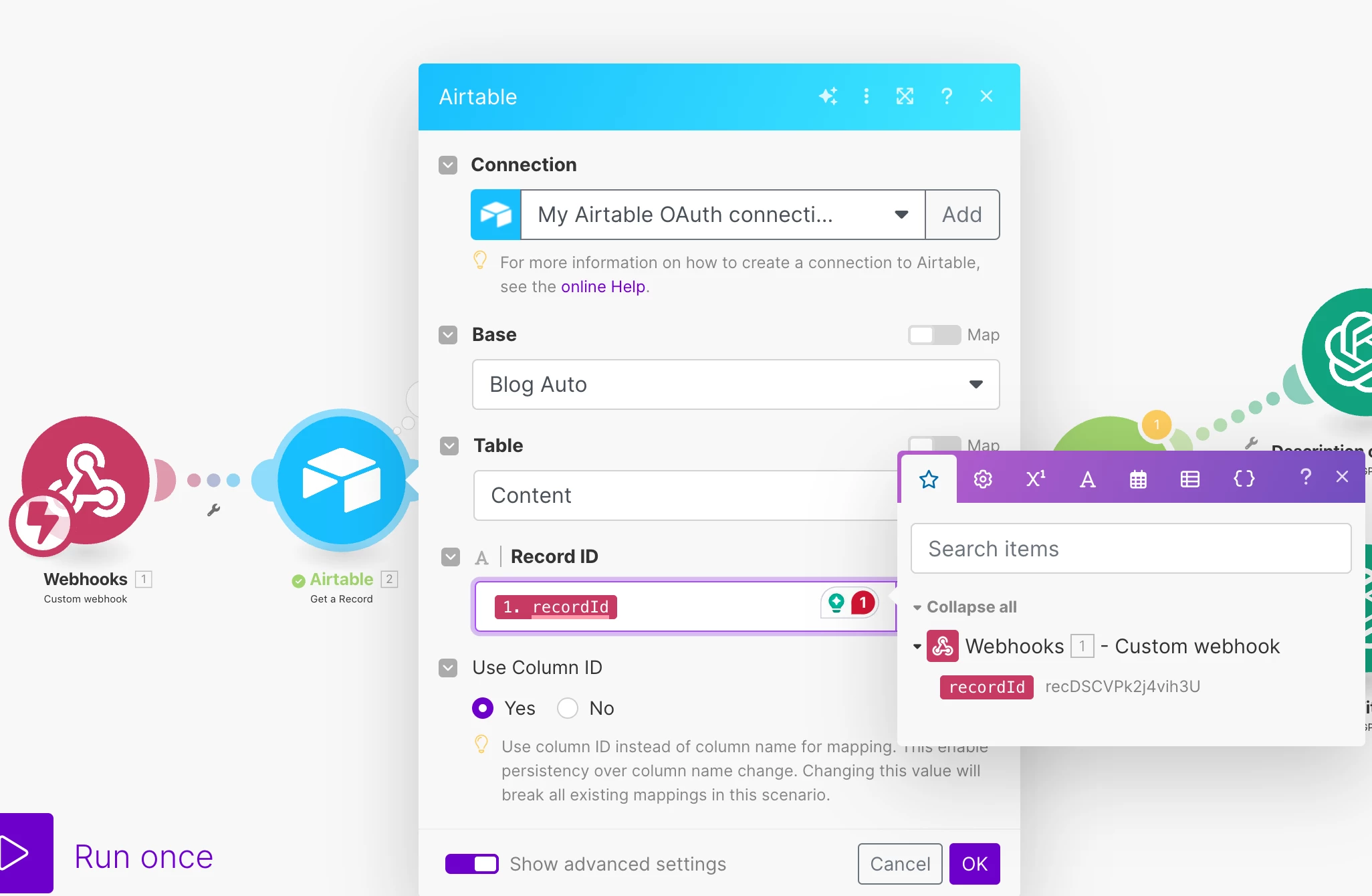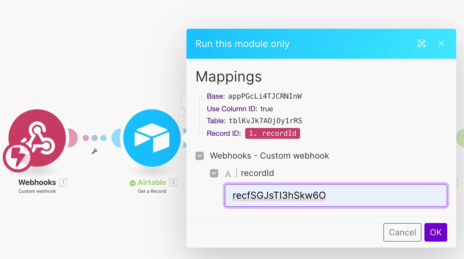 STEPS: (STEP 1: connecting with Webhook => OK). STEP 2: Getting a record from Airtable and put it into make to transfer the info into Google Drive (video transcript).