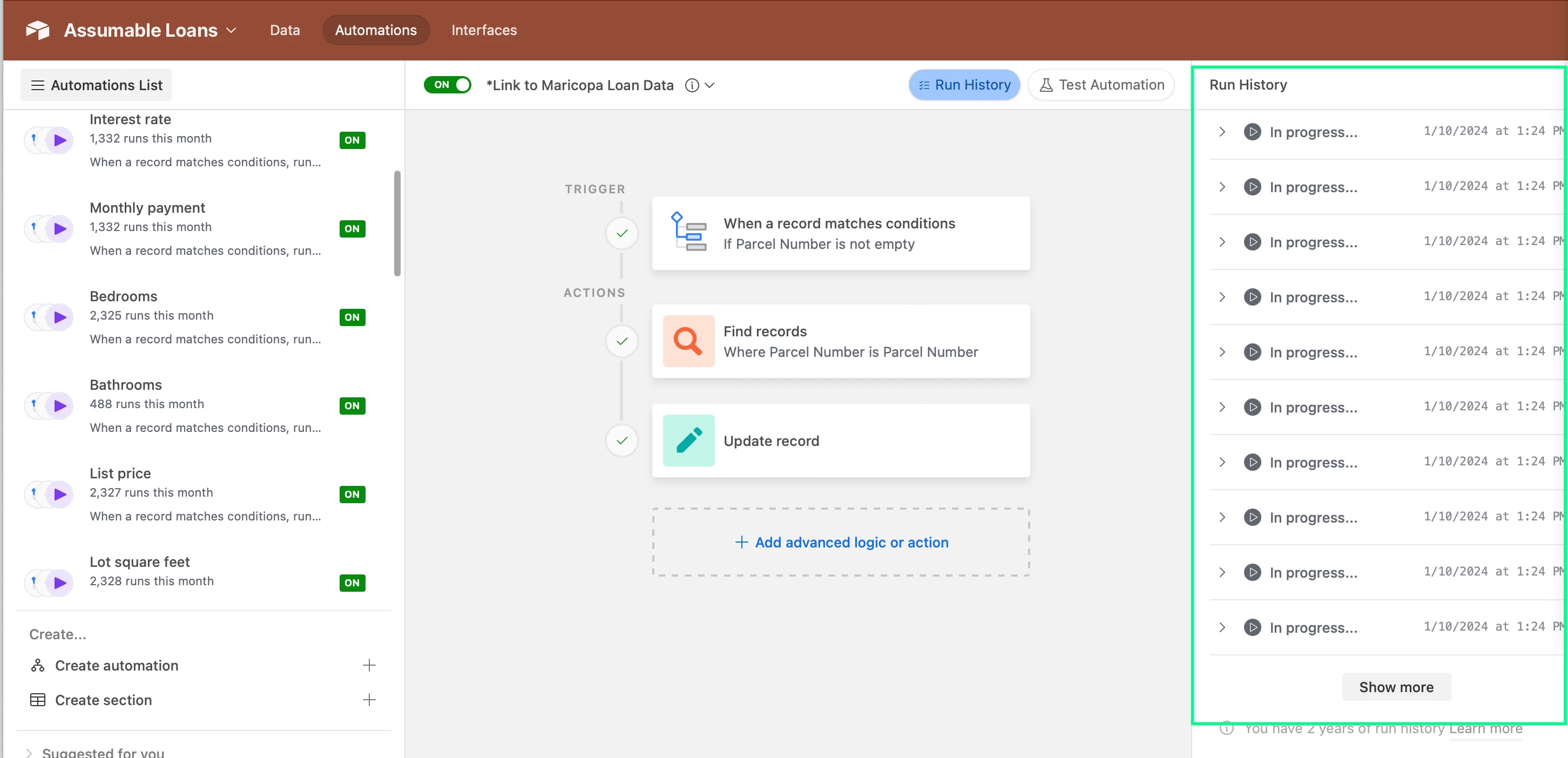 I have an automation set up to find linked records from another table. The problem is, it won't run! It just says in progress. What am I doing wrong? If this is a rate limit issue (I have 458 records), how can it be avoided?