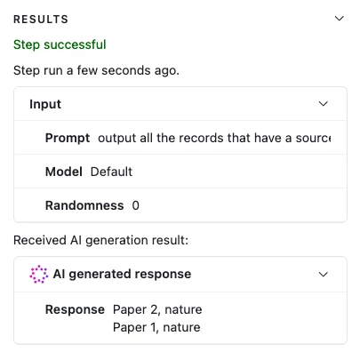 I’m running into a strange issue. I have a table of records that I filter by ‘Created date’ before passing it into “Generate text with AI.” At this AI stage, I’m just filtering entries where the Source is a scientific source (peer-reviewed papers, preprints, PubMed, etc.).