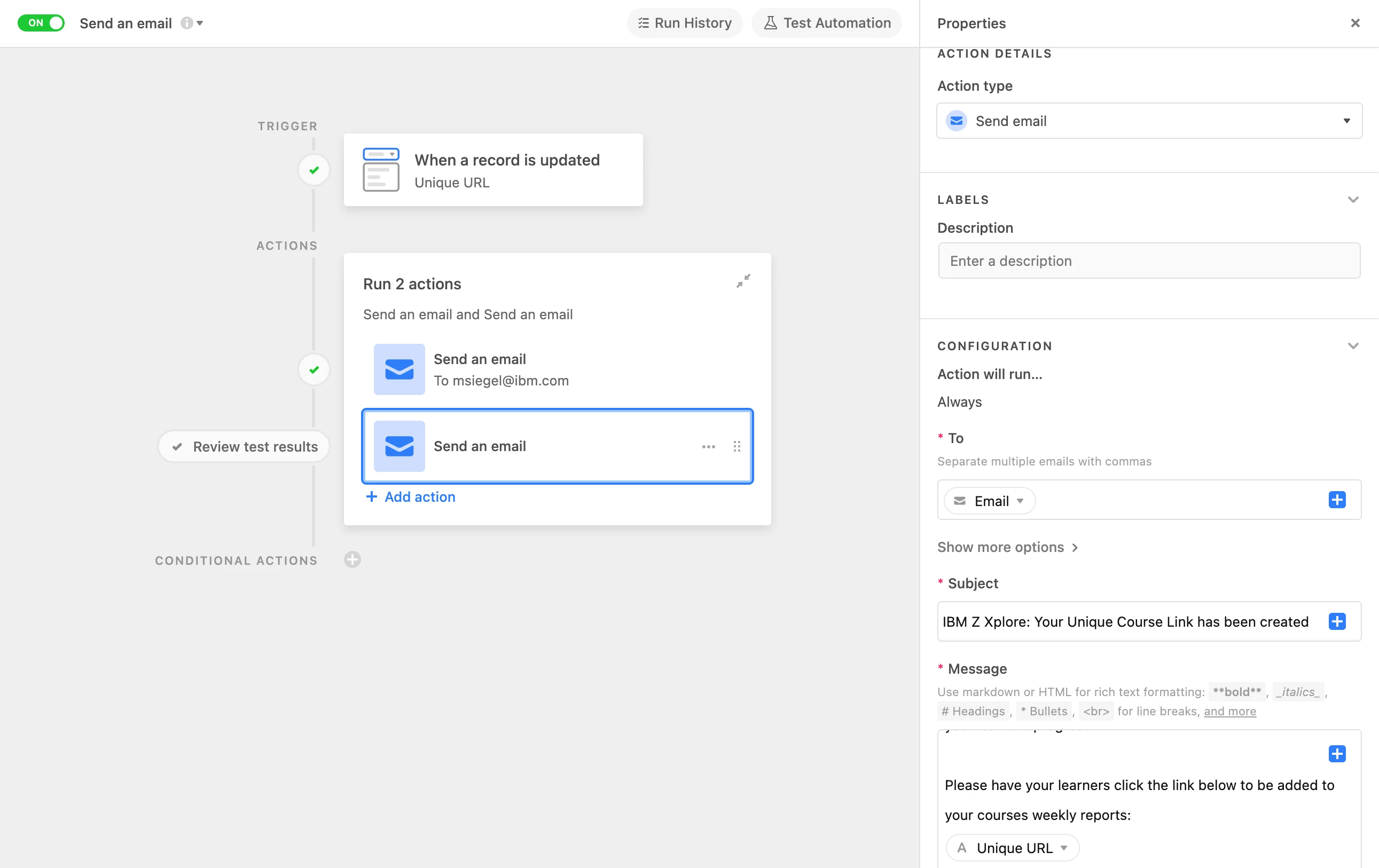 I am trying to set up an automation where when a record is updated, the email column in the same row as that record receives an email with the information in the updated record.