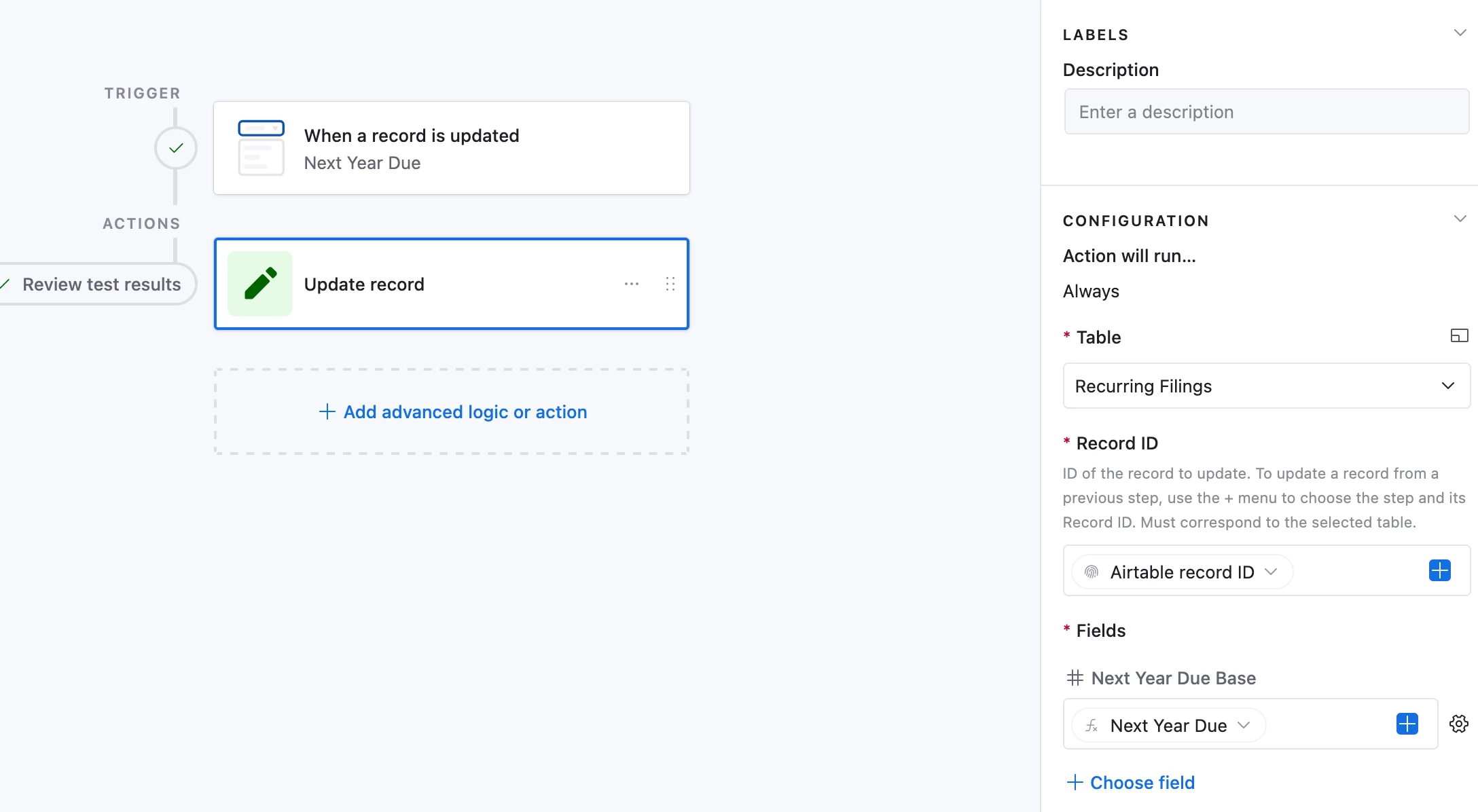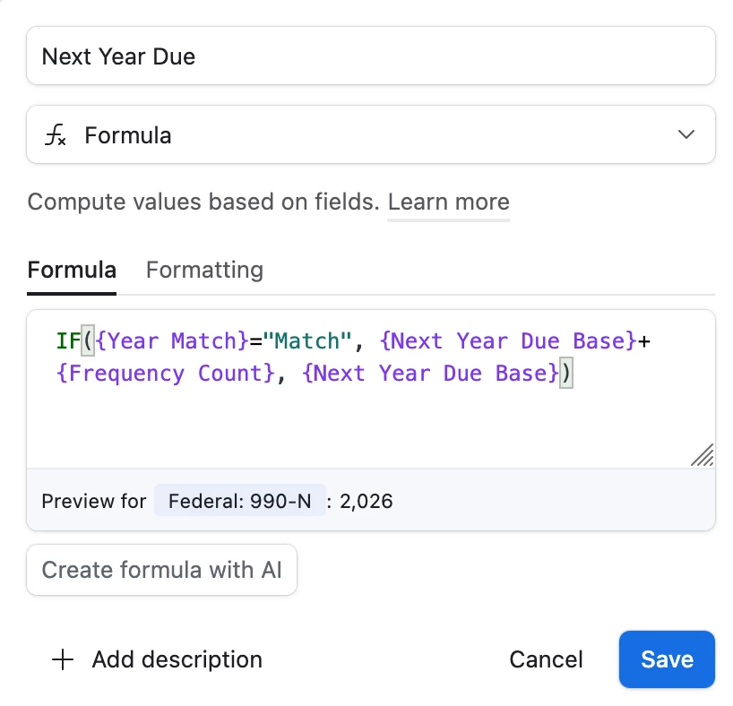 I work for a small nonprofit and am trying to build a base to track our required legal filings. I have tried generating formulas and/or automations to help create an auto updating due date field but nothing that I have found to try is working.