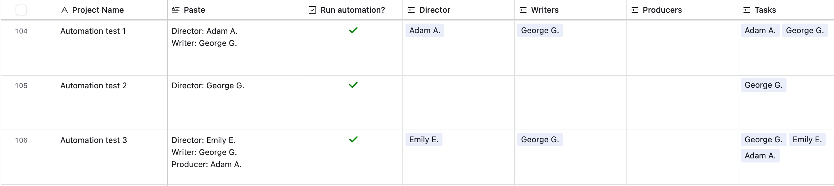 Each email contains the name of several people associated with the project’s production team: directors, writers, and producers. I have a separate table that is a Master Contact List of all the names that have ever been entered, and in my main Project table, I have a linked field called Production Team that links to the Master Contact List. Multiple linked records are allowed so that multiple people can be logged in that field in the Project table.