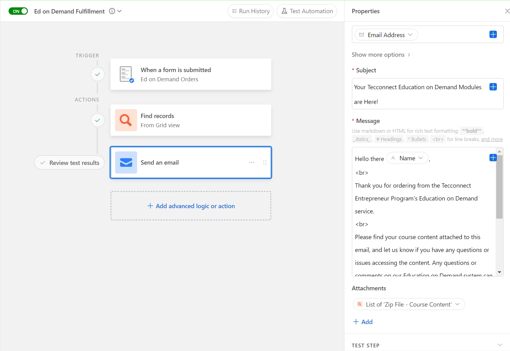 The actions I'm using are 'When a form is submitted', 'Find Records', and 'Send an Email'. I've attached images of the form and the back-end of the content. Thank you in advance to anyone who can help with this piece!!