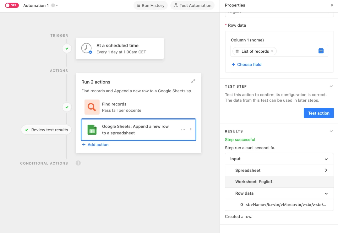 I attach the screenshot of the airtable table, the screenshot of the automation and the screenshot of the results on google sheet.