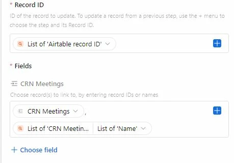 I've set up my automation to trigger with the Application status being marked as "accepted", then I used the Find Records action to find the related record in my Customers table. Lastly, I used Update Record action to update my Customers table, specifically the Workshop Registrations field, where I want all historic workshop registrations of a particular customer. As you can see below, I first selected the field from Find records that contained the existing workshops of a record, then, I added another field that brought in the new workshop selected by the customer in the form: