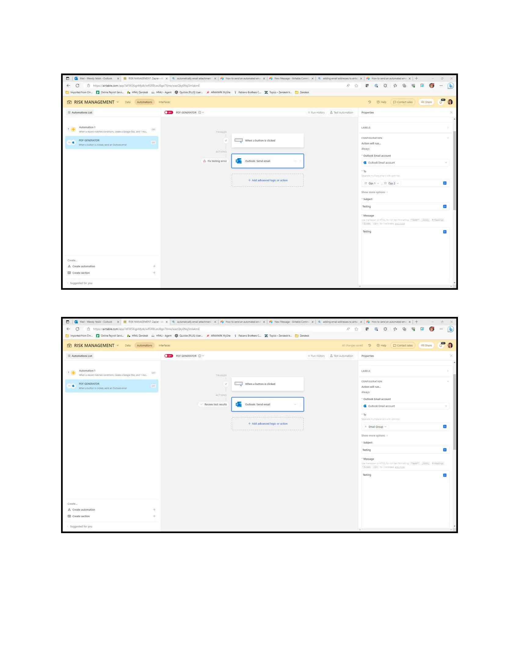 I am setting up automation and need to program "To" to grab the emails from a field in my airtable base. For example, when I need to send a report to just the operations department, I want to assign that report to that email group. I use Outlook Email for the automation. Here are some screenshots. I can't get the automation to recognize a field I enter with the email addresses. I tried a field using the addresses as one line separated by a comma and then tried three fields with a different email address in each. Neither worked.