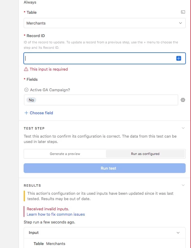 I created the trigger, tested it and it works fine. But the Action is where I keep running into the "Received invalid inputs" error. This is mainly due to the Record ID that's causing the issue it seems. It seems I'm not alone on this issue. I searched on here for answers but it's still doesn't help. What am I missing?