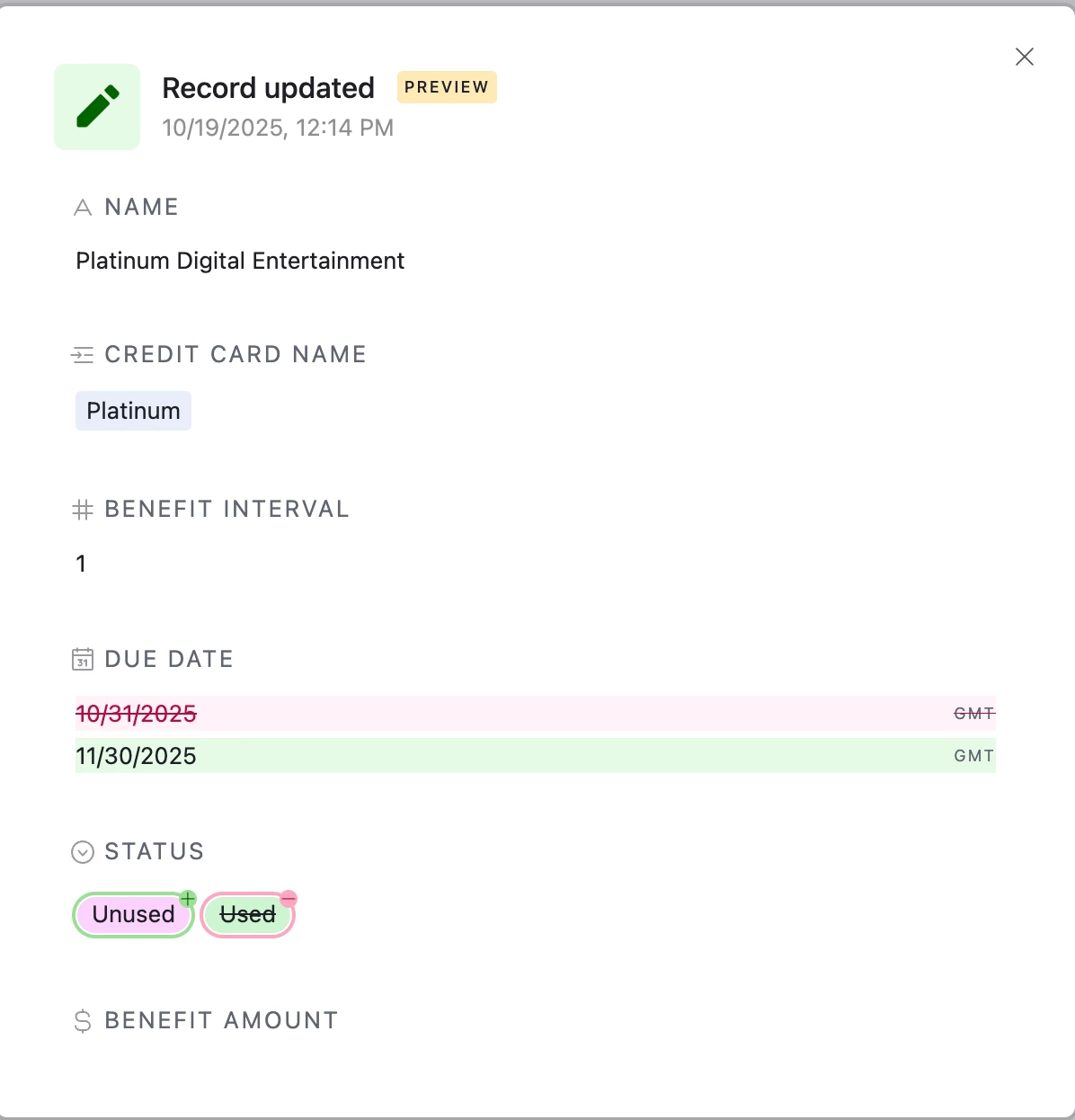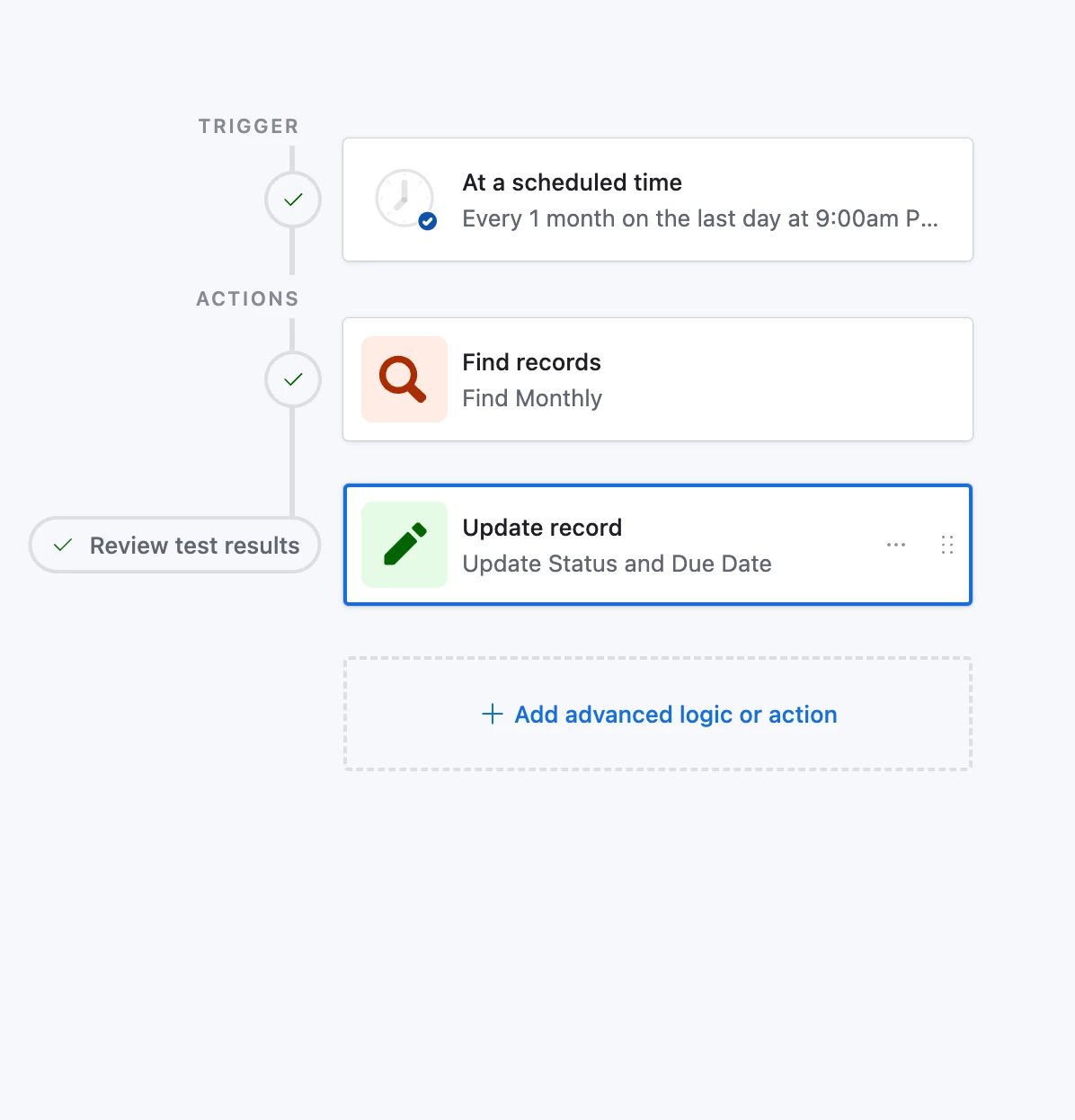 I am using a Free account right now and have a fairly simple automation where every month, if a record as Due Date in the past, the Benefit Interval is 1 I want to update two fields. I want to update the Due Date to the next month, and change the Status to “Unused”.