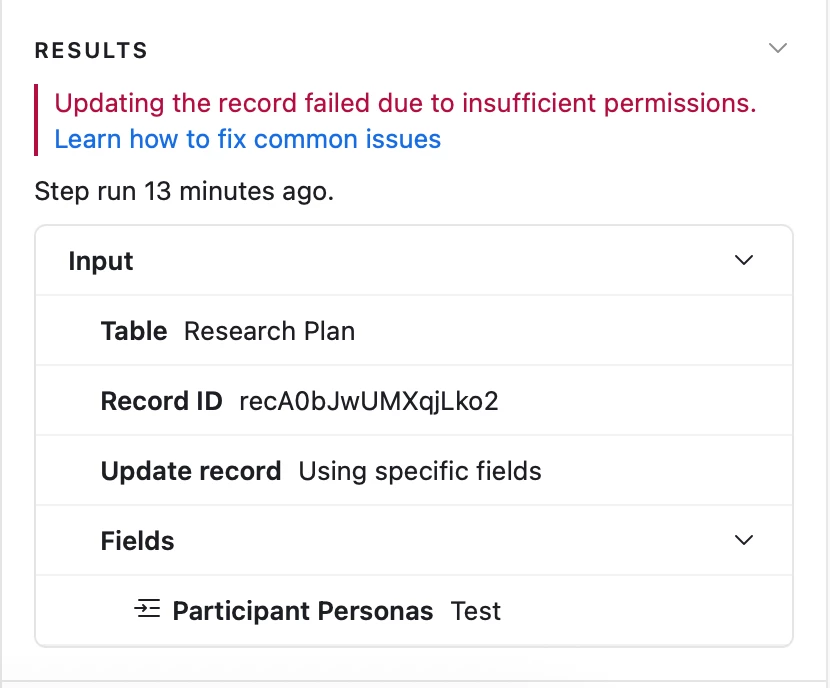 However, the automation fails with the error: “Updating the record failed due to insufficient permissions.”