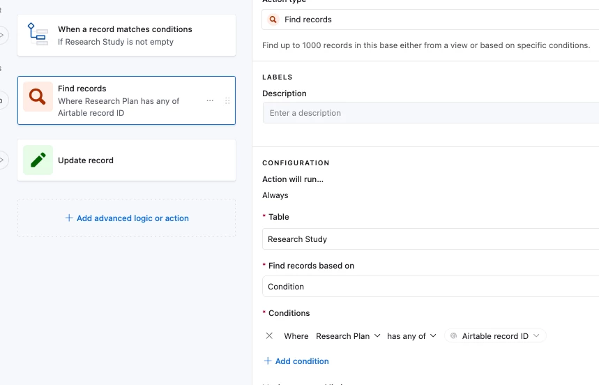 - Trigger: When a record is created (Research plan)