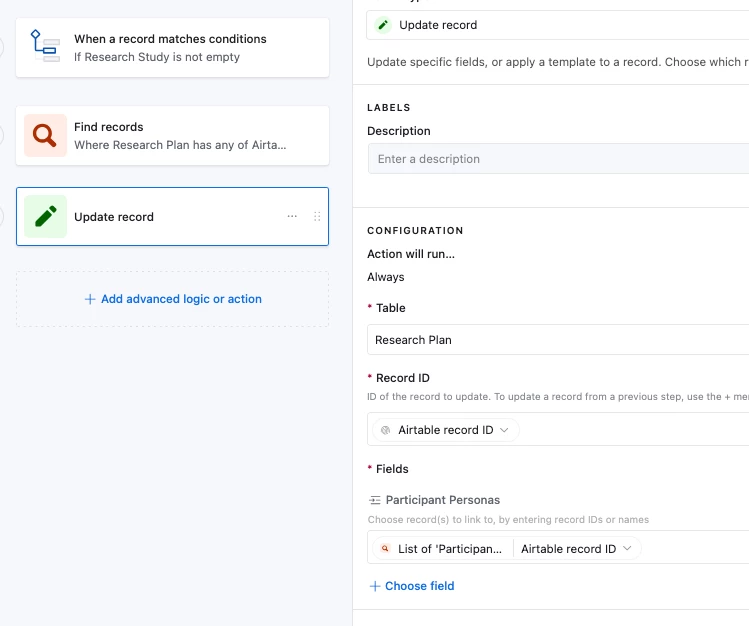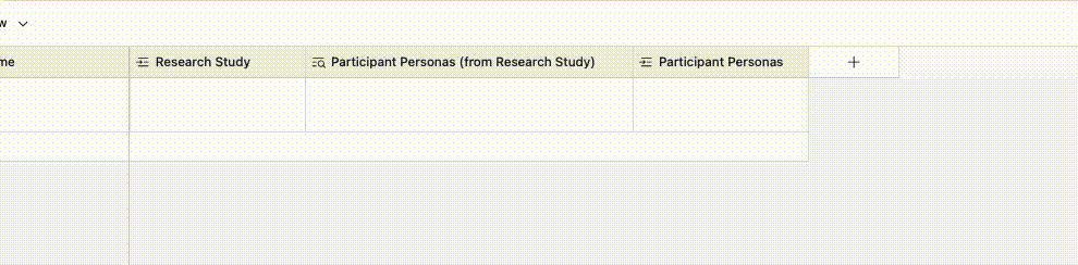 We have a table called Research plan with a linked record field (Research study) pointing to another table. In the Research study table, there’s already a Persona field populated.