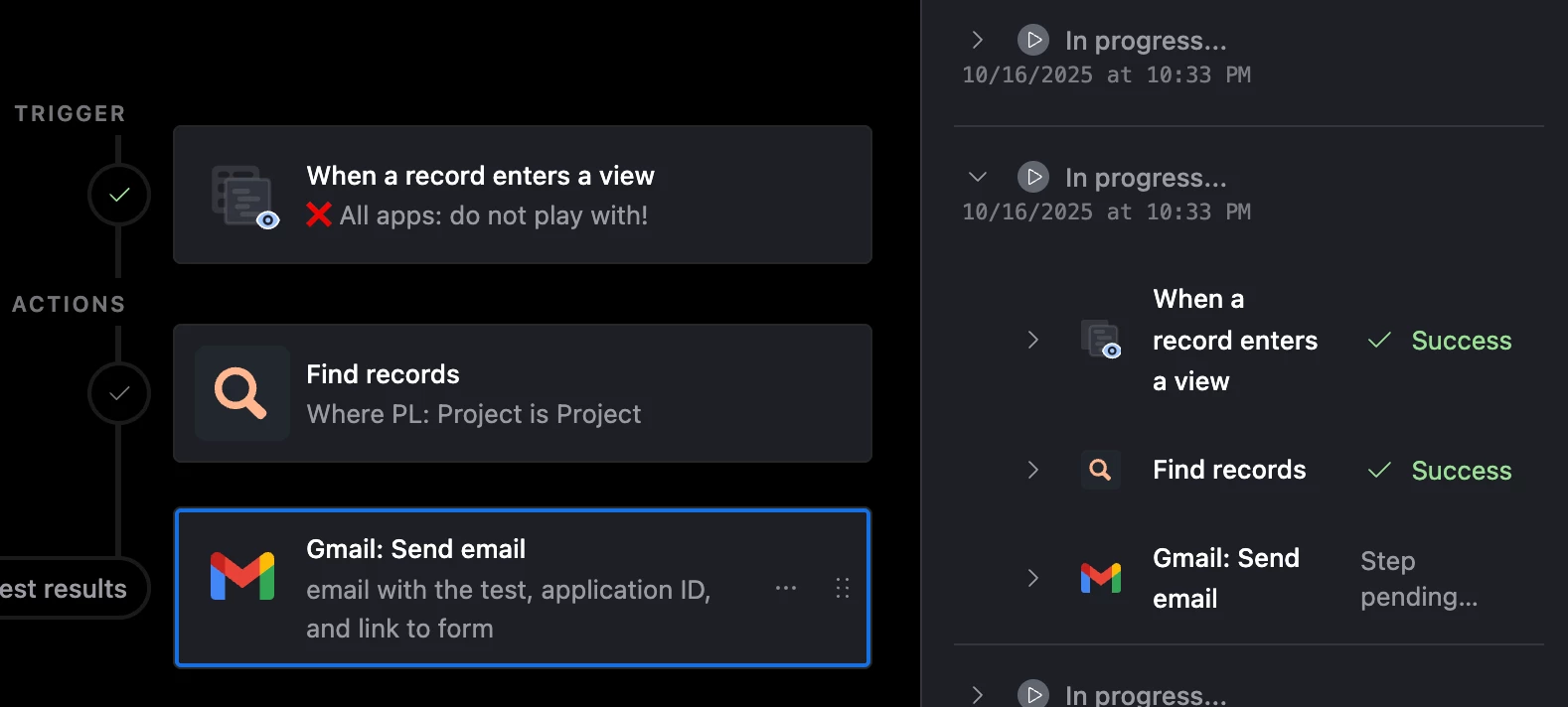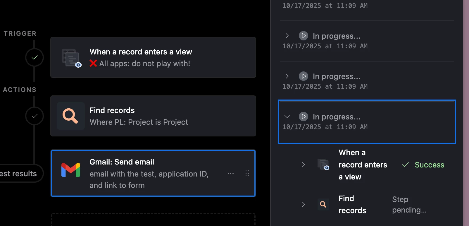 2.Runs stuck at different steps. The automation has two steps: find records, then send email. The earlier runs are stuck at the step of sending an email. This makes it hard to verify which part of the automation is malfunctioning.