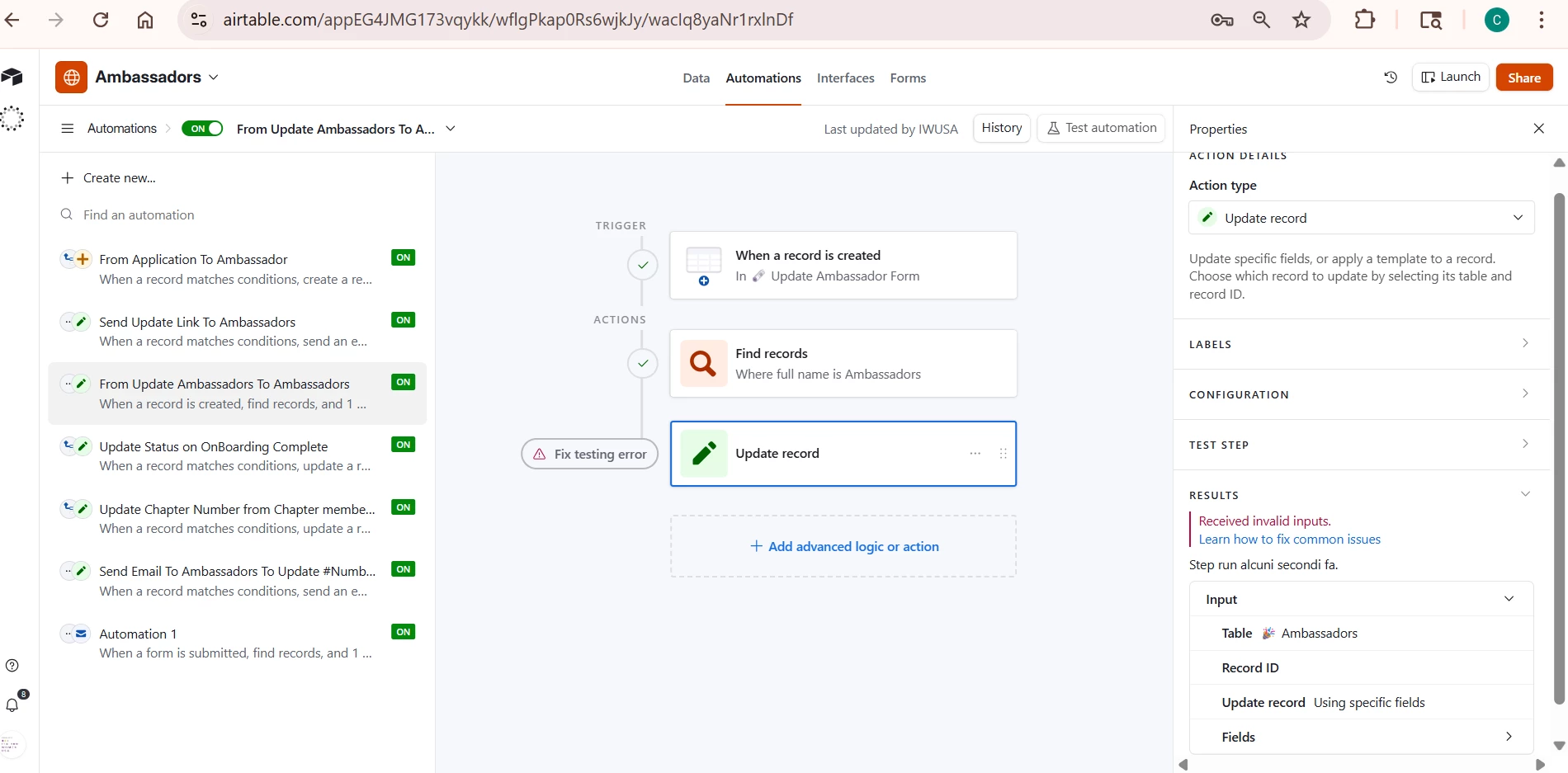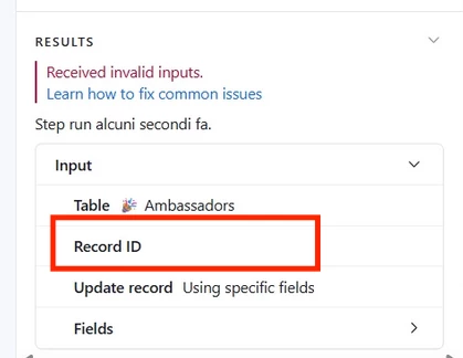 Assuming the error is because the ‘Find Record’ step can’t find an existing Ambassador record, you could try adding a conditional step into your automation so that it looks ike the following. The idea is that if it manages to find an Ambassador record with the same name it’ll link it, and if not it’ll create a new record and link it