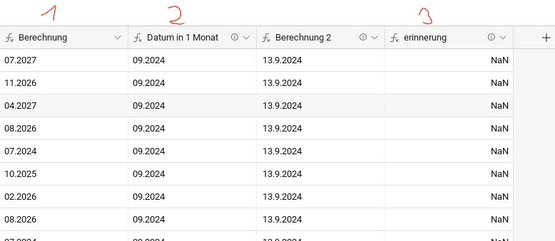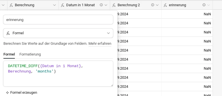 The problem comes from the fact that your formulas "Datum in 1 Monat" and "Berechnung" are not considered as date type fields, meaning that you can not pass them to the "DATETIME_DIFF" function.