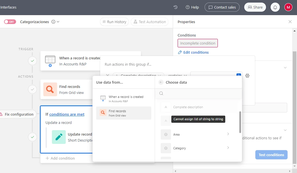 3. So, when a record is created in Table 1 AND CONTAINS ANY OF THE WORDS from the primary field of Table 2 'Expense', I want it to be placed in the column 'Details' in Table 1.