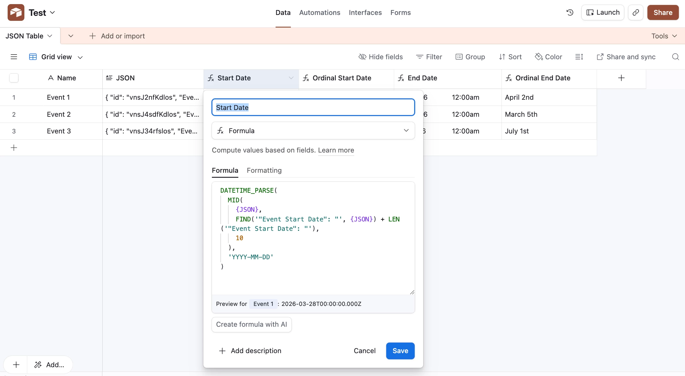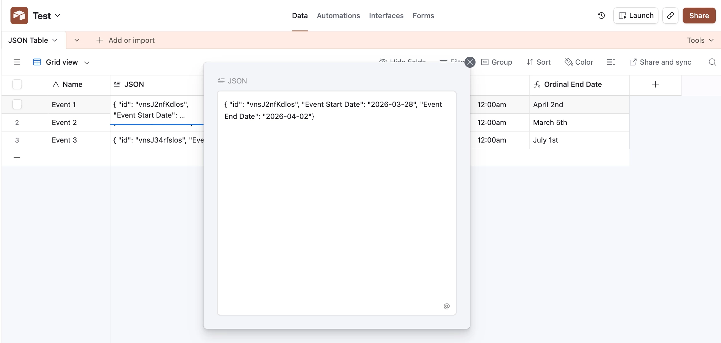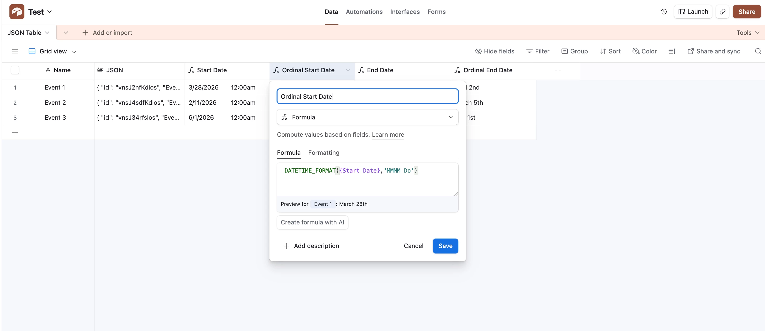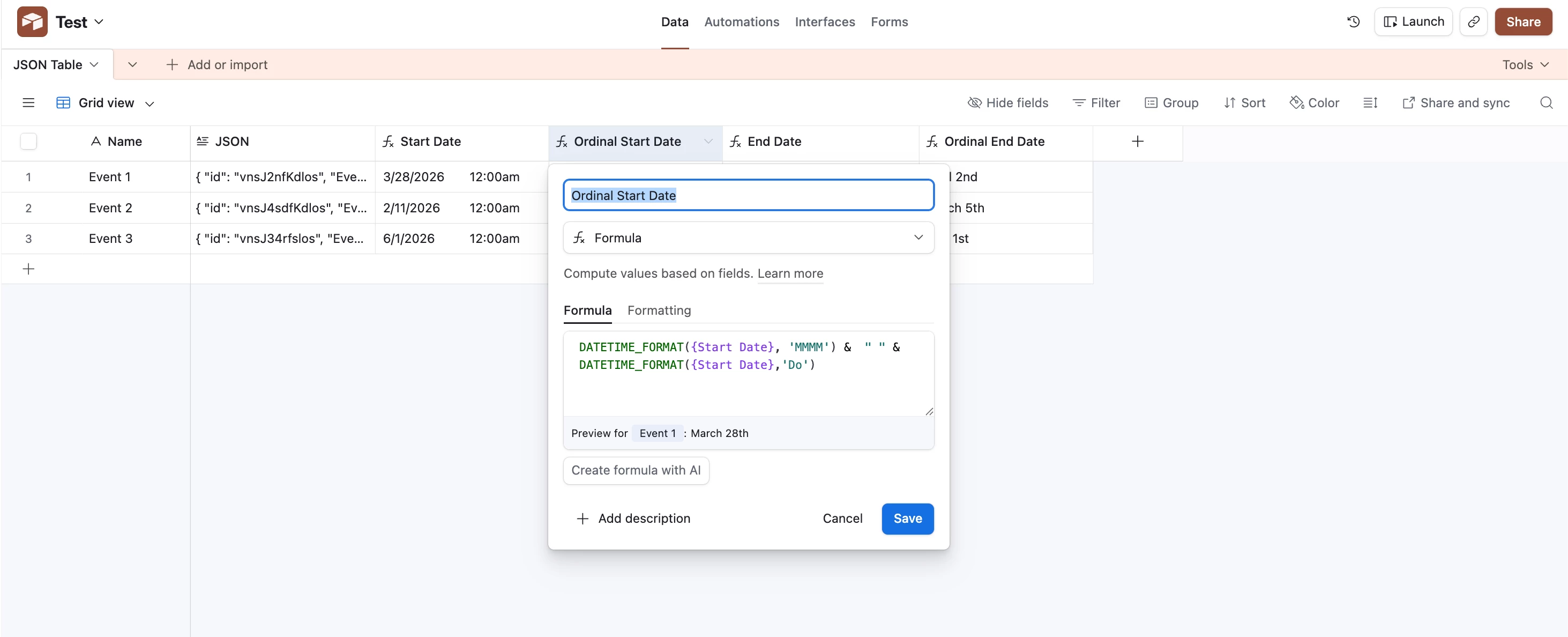 Hello everybody I have been working on some AirTable Automation scripts and I figured people might need some help on working with Dates and Times using Javascript on the platform so I am here to share with the community a little guide on both working with AirTable records with Dates along with how to convert them over to JSONs and access/modify them. I specifically cover how to get Ordinal values from the day of the month along with getting the name of the month from the numeric value of the month!