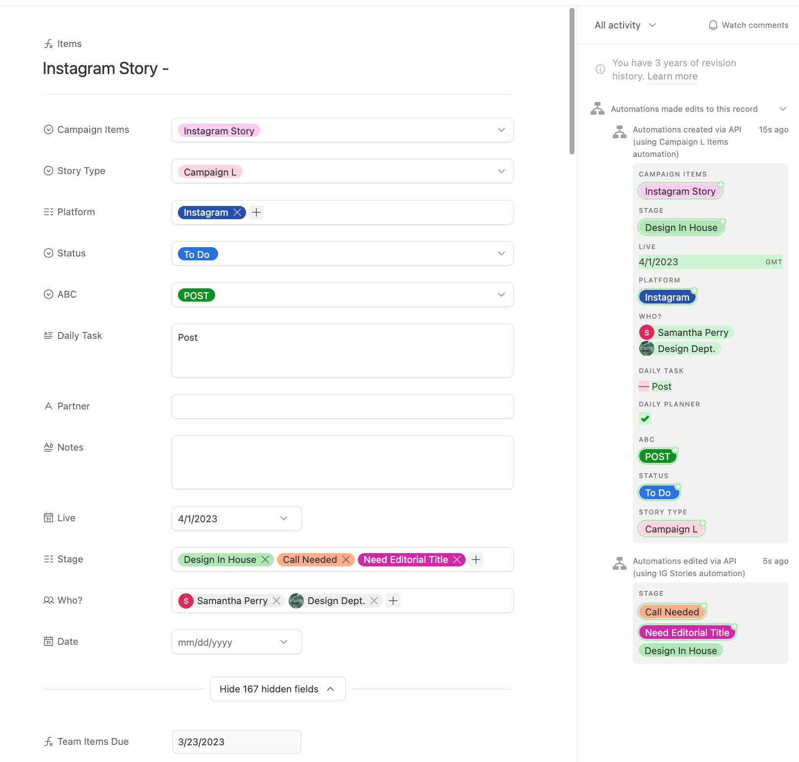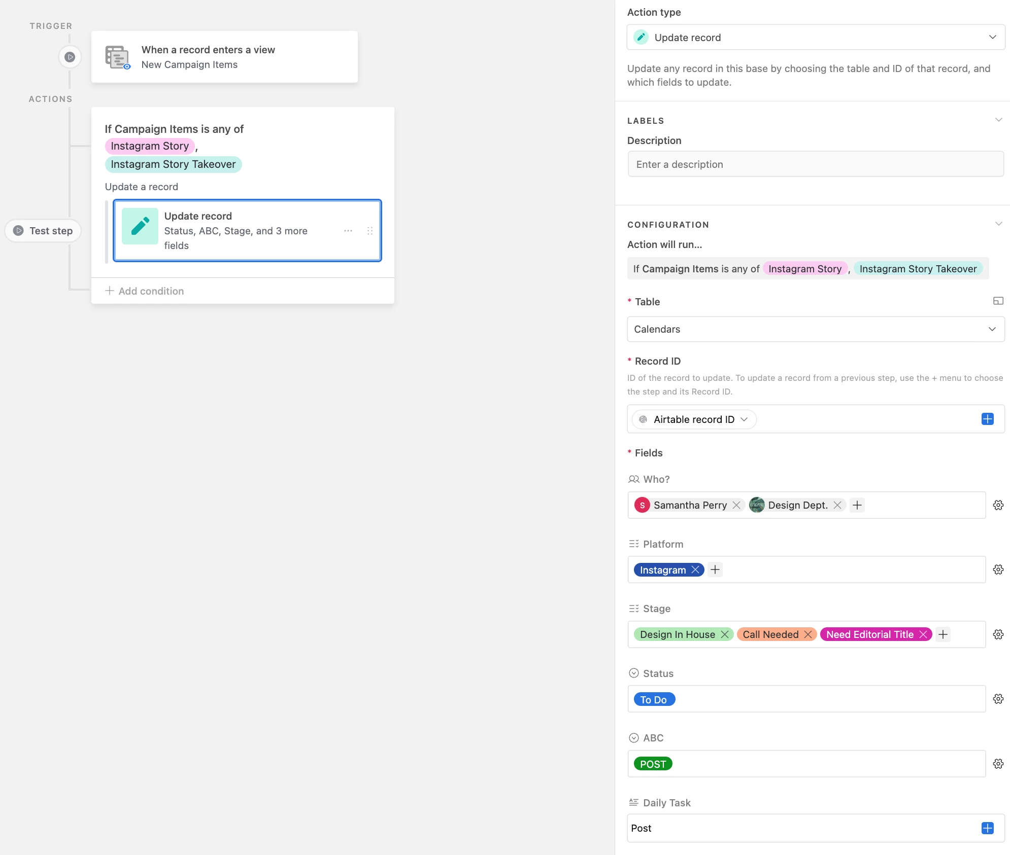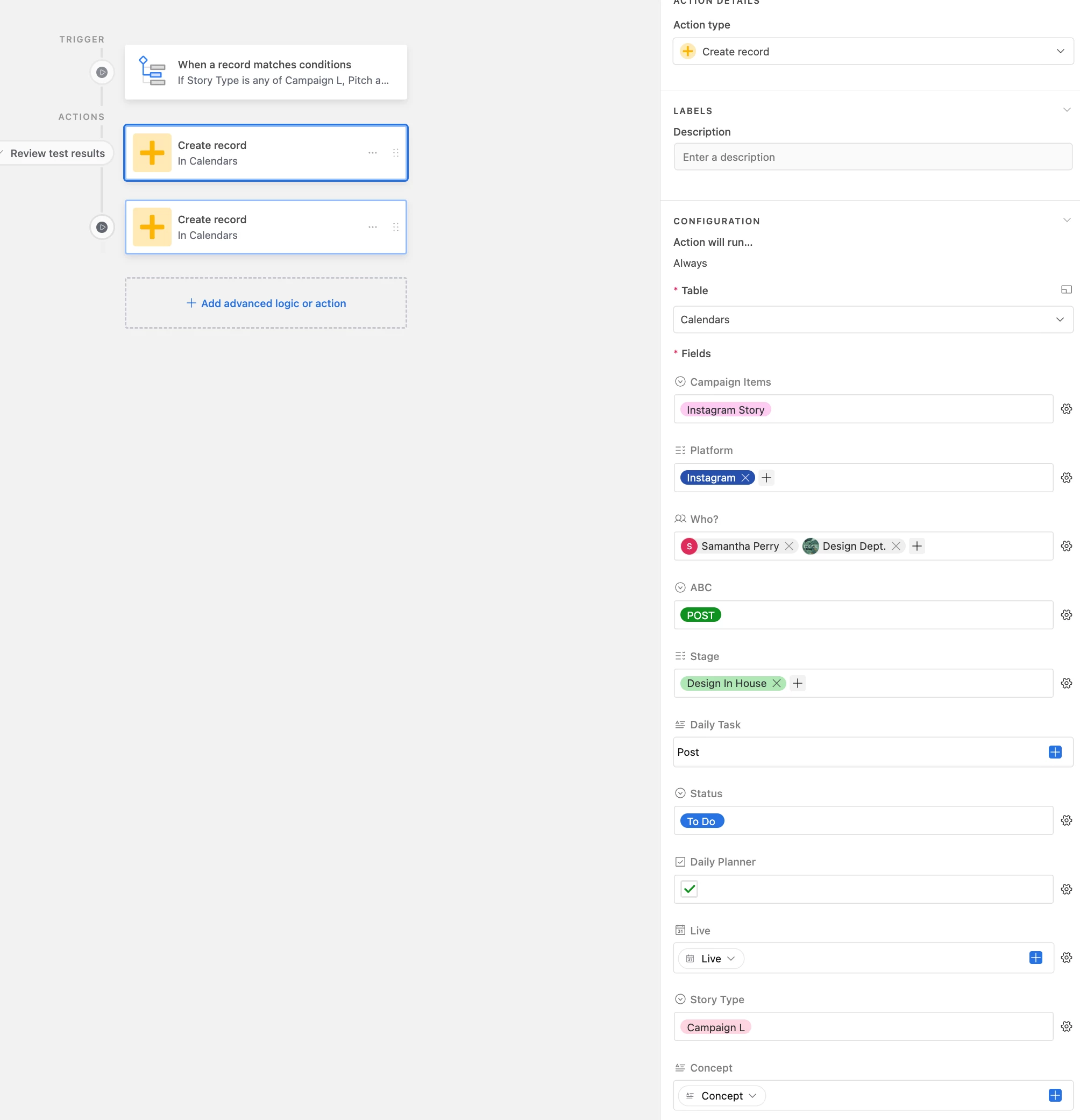 We have 7 different “campaign” types we sell to our advertisers, many of which have overlapping items (i.e. and Instagram Story). I want to create automations so that when a new record (Campaign A) is created, all of the line items for that type of campaign are also created, along with their starting point for each cell. The issue I am having is, since Campaign B also has an Instagram story, but has a different starting point, the cells within the Instagram Story line are initially populated correctly and then overridden by the other automation. Is there a way to have them both be live, or will each line item in every type of campaign have to be different, even though they are the same product? I’ve attached two screen shots of the different automations for you to see what I mean…