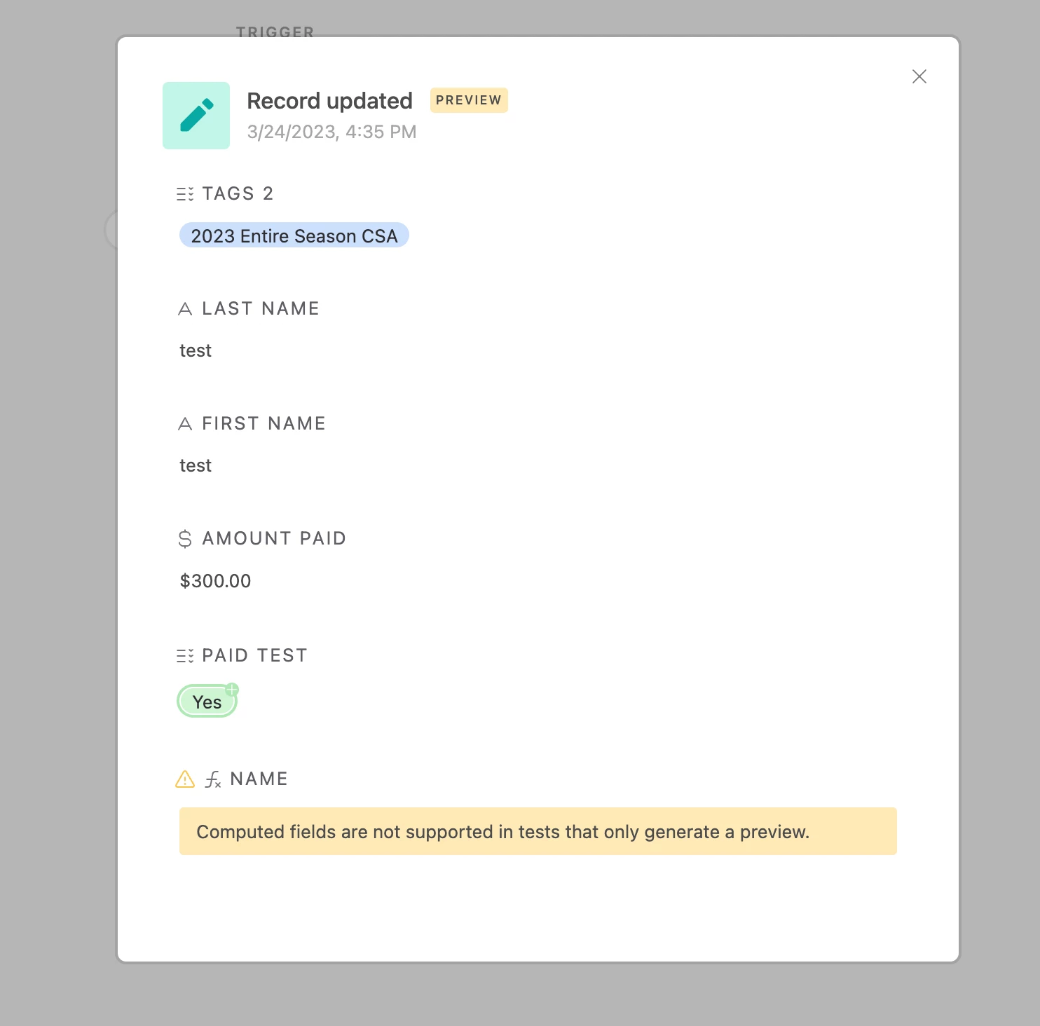 I have a very basic automation and I can't figure out why it doesn't seem to be working.... when the amount paid is equal or greater to $300, I want to have a check box or single select text that says they are paid in full.