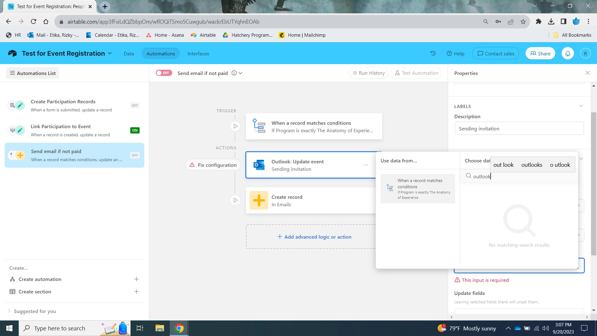 Issue: When I try to build the automation, I get stuck on the portion that asks me to select the Outlook Event ID. I assume this refers to the actual event on the Outlook Calendar, but when I try to scroll through the options, nothing shows up but existing Airtable fields. Screenshot attached.