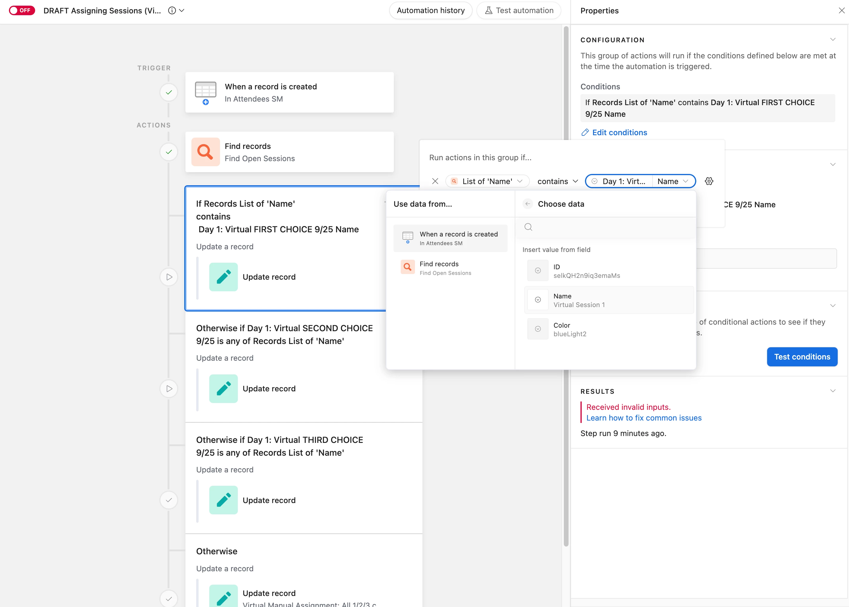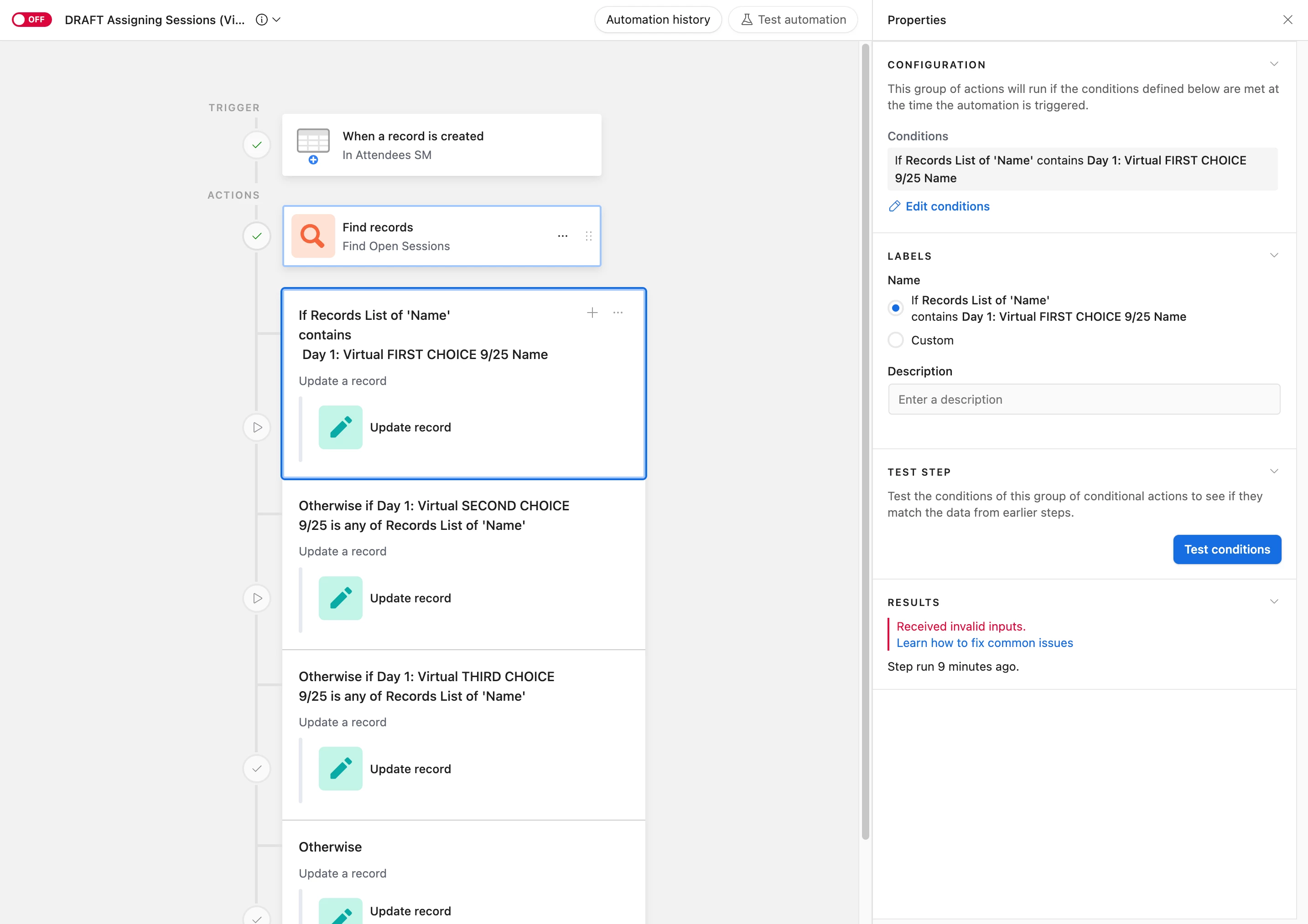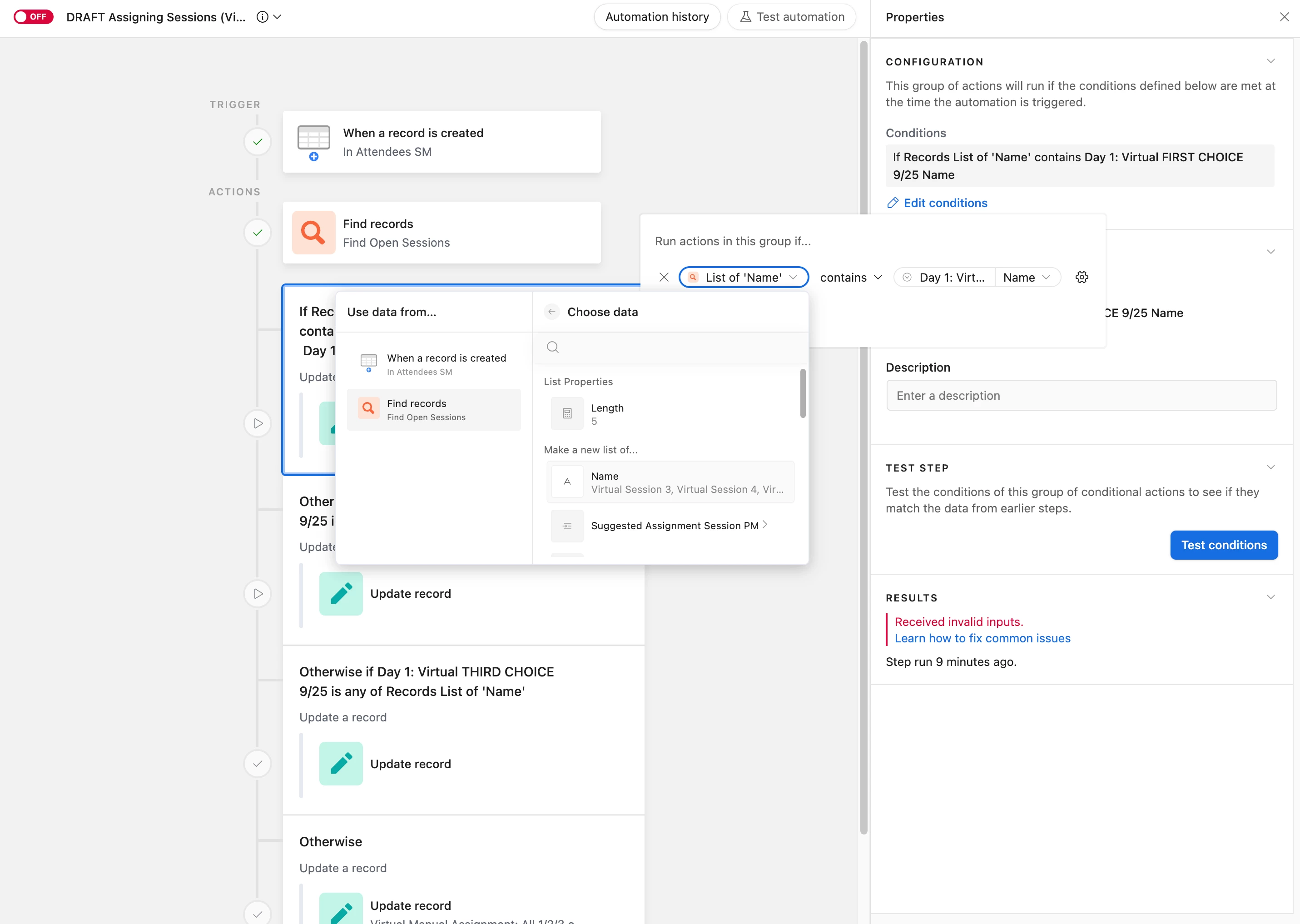 It seems that the issue is in the conditional action that is set to run IF the "List of names" (pulled from the "Open Sessions" view that is pulled from the "Find Records" action above) CONTAINS the "name" value of a single-select field that is pulled from the record created (which is the automation trigger). The error message says "Received invalid inputs" but I haven't been able to identify the issue.