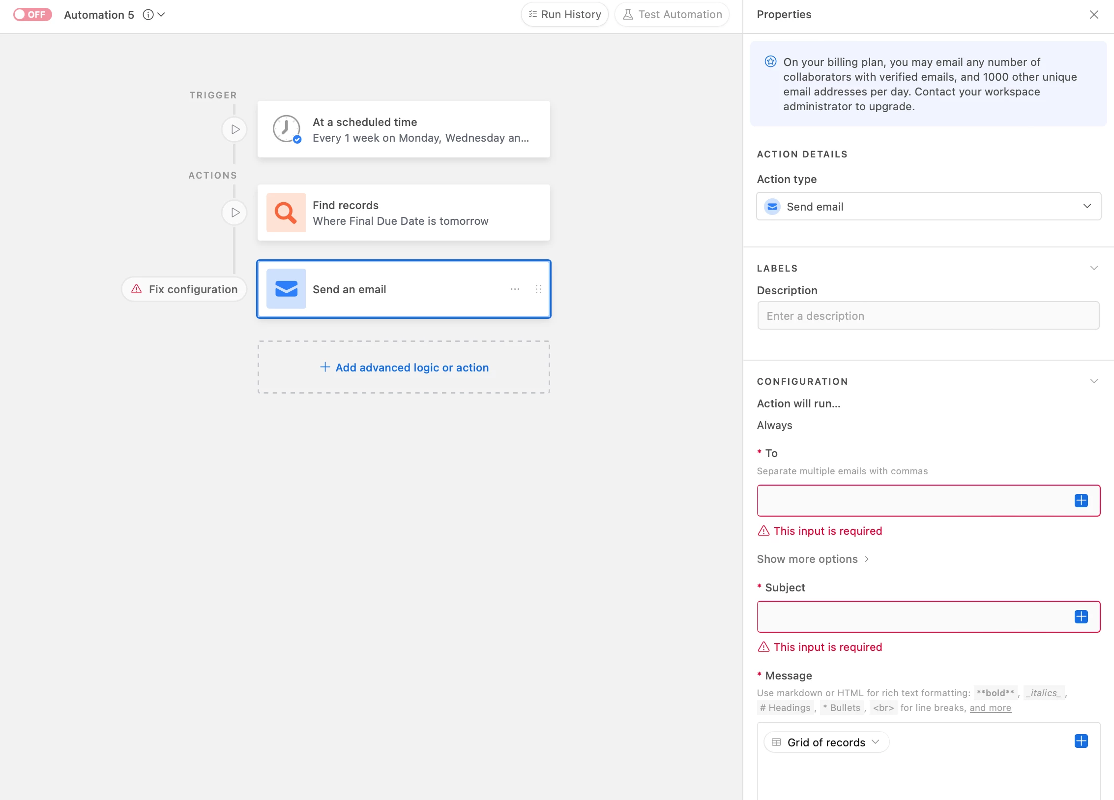 For our project management team, I want to create an Email Digest Automation where Every Monday/Wednesday/Friday at 1:00 PM for example, if there are Rush or High Priority Tasks coming up (Final Due Date) tomorrow, the email sends to those to who are responsible for each tasks.