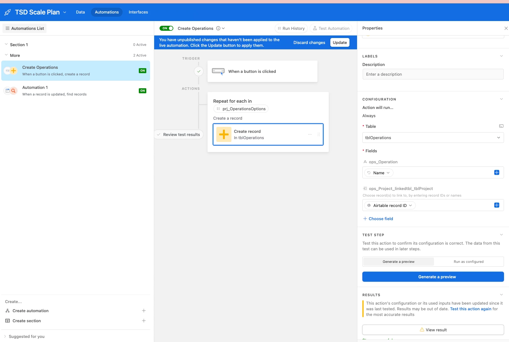 I had an automation that successfully took values from a list field in a projects table (tbl_Projects), and created separate records linked back to the project in an operations table (tbl_Operations). It was triggered on a button.
