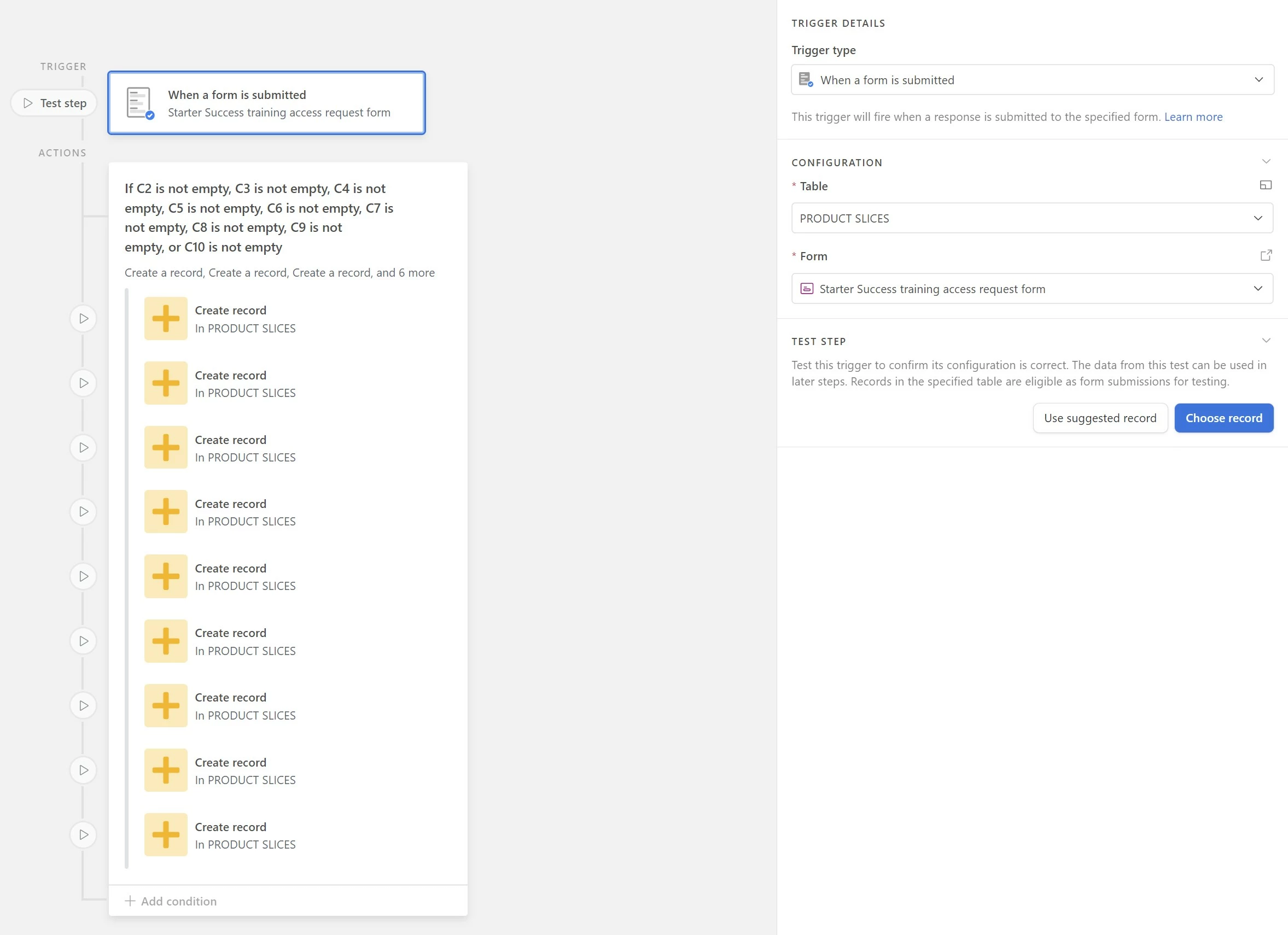 I have set up an automation that creates records in a Product Slices table as submissions are received. However, the automation creates 10 records in the table regardless of nominated subscribers submitted (resulting in a lot of blank records!) Furthermore, the Organisation name does not populate for the first record created for some reason (see attached images).