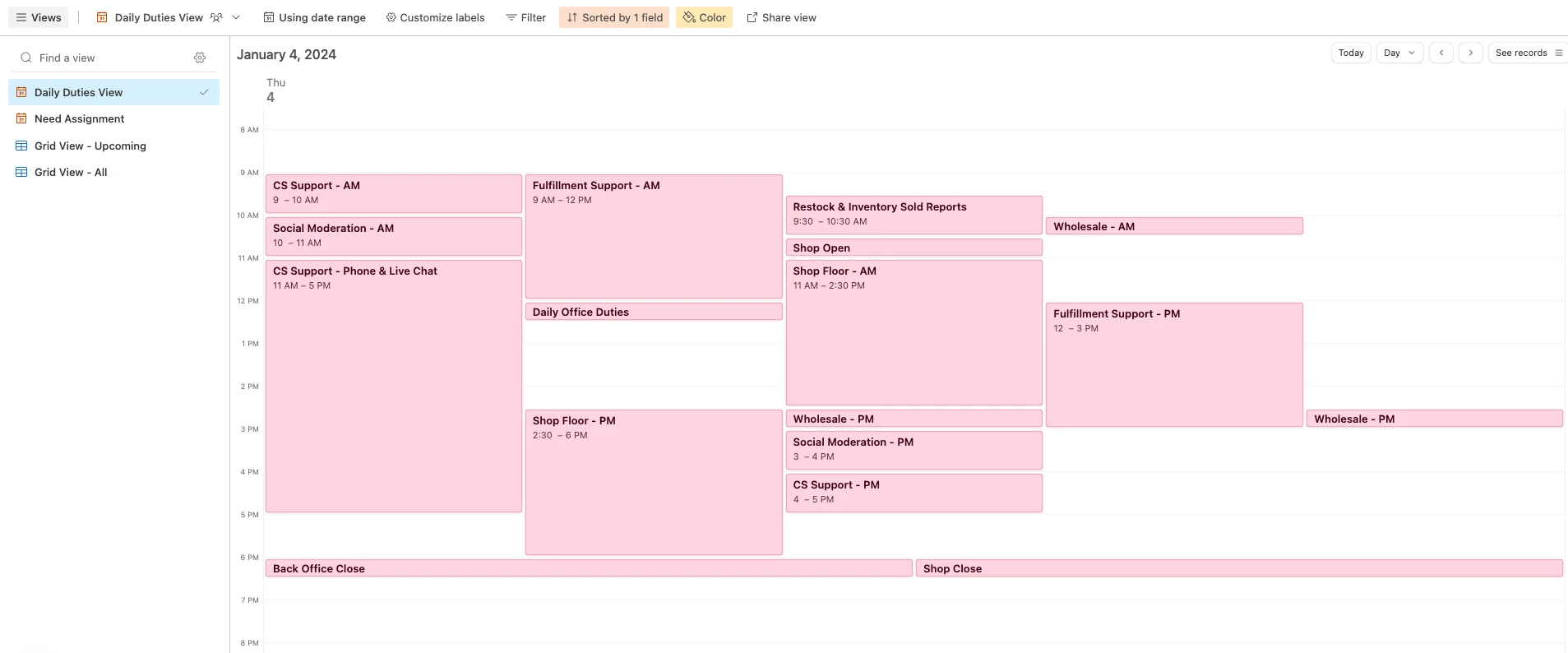 The issue I'm having is in maintenance - currently we are duplicating the empty records weekly which is cumbersome and time intensive. I'm sure there is a way to do this via automations, but the issue I run into is date/time fields - running an automation to create records at a date/time, but neither configuration for start/end time - static or dynamic - is getting me what I'm looking for. We have both a start and end time so that it can be easily shown in a calendar view like the attached image. Any advice? I've bopped around here on the boards for a bit now but haven't found a particular case that matches what I'm looking to solve. Thanks!