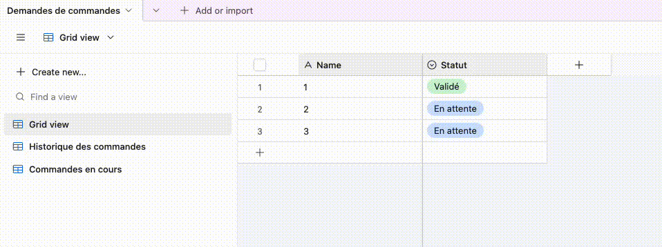 Demandes de commandesest configurée pour permettre le tri et le regroupement visuel des demandes par Fournisseur.