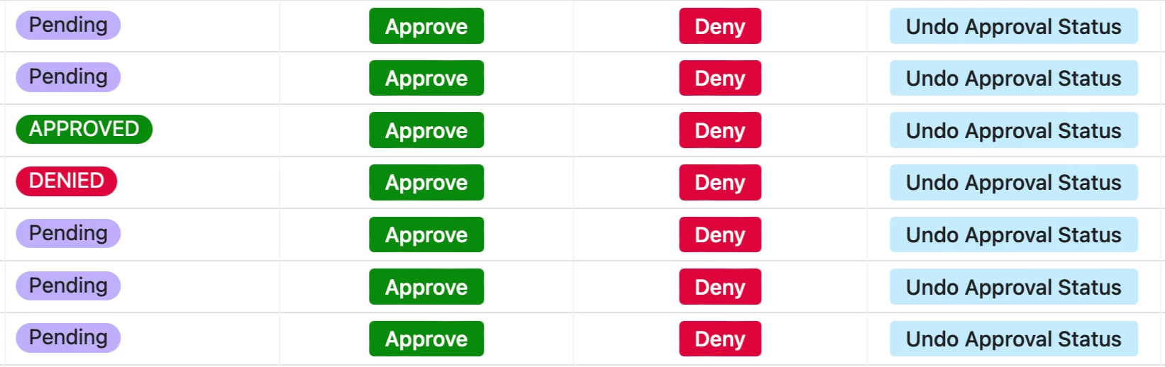 I have a list of 100-200 sign-up's on a shared view (that's embedded in my website, so it "should" update), and I want to have a public user "Approve" or "Deny" each sign-up by clicking a field button (see screenshot) that would update one Select Field in the respective row. This process happens only once a year.