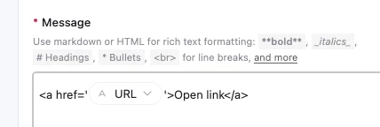 I have tried "<a href='" & {Your Formula URL} & "'>Open link</a>" and it did not work.
