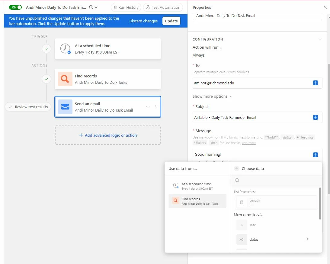 It looks like in the email that I am able to do attachments and either use data from the trigger (at a scheduled time) or action (find records). But when I click on Find Records....it will not let me choose anything...I either see invalid choice for input, cannot assign list of string to collection of complex types.