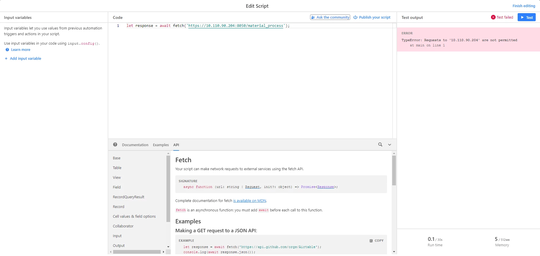 Right, but that's because 192.168... is on your local network. When you run code from Airtable, you are using their servers. You cannot access a 192.168.. (ie local address) from an Airtable script. You will need Flask running on a public server that you can access. The original code you showed had a public IP address - that's what you need to be using. Which was why I was saying to be VERY, VERY careful when it comes to security and SSL policies. You NEVER want to expose any production servers - especially ones containing important (non-dummy) data - without having a very clear business case.
