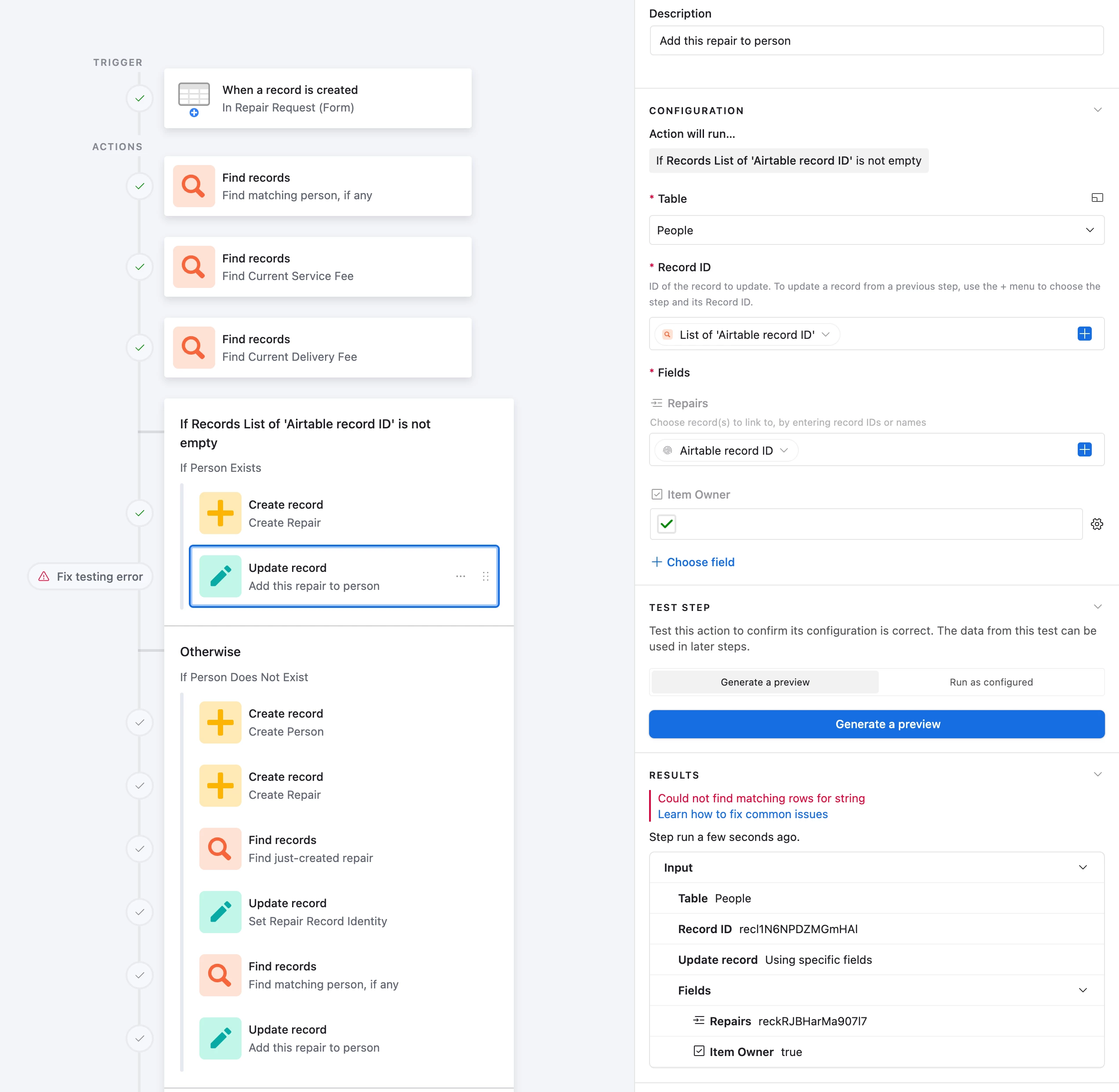 When someone submits a request, part of the automation looks to see if the same first name–email address pair exists on a record in the People table. If so, it creates a Repair record and attaches the existing Person record as requestor. Otherwise, it creates a new Person record, then a Repair record, and attaches the new Person record as the requestor.