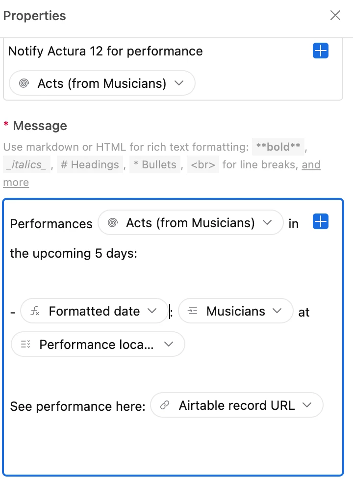 When inserting a Date field in an Email Action, the Date and Time format I’ve set within the table does not get used. Instead, I get the default formatting, something like: 2020-06-07T01:00:00.000Z. I’d like the date and time to be outputted in a more readable format in emails, something like 6/7/2020 at 1:00am.